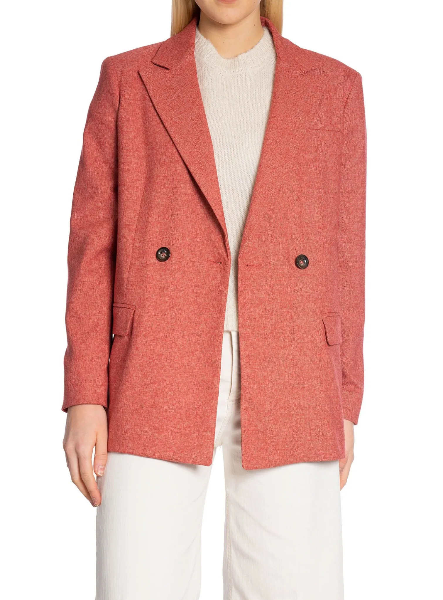 Wanda jacket from Mos Mosh. An elegant blazer in red melange with beautiful buttons at front and sleeves ends. It features sharp shoulders, double breasted front and slit at the back accentuated with buttons. Lined. Wear with a white top and denim for a stylish everyday look!