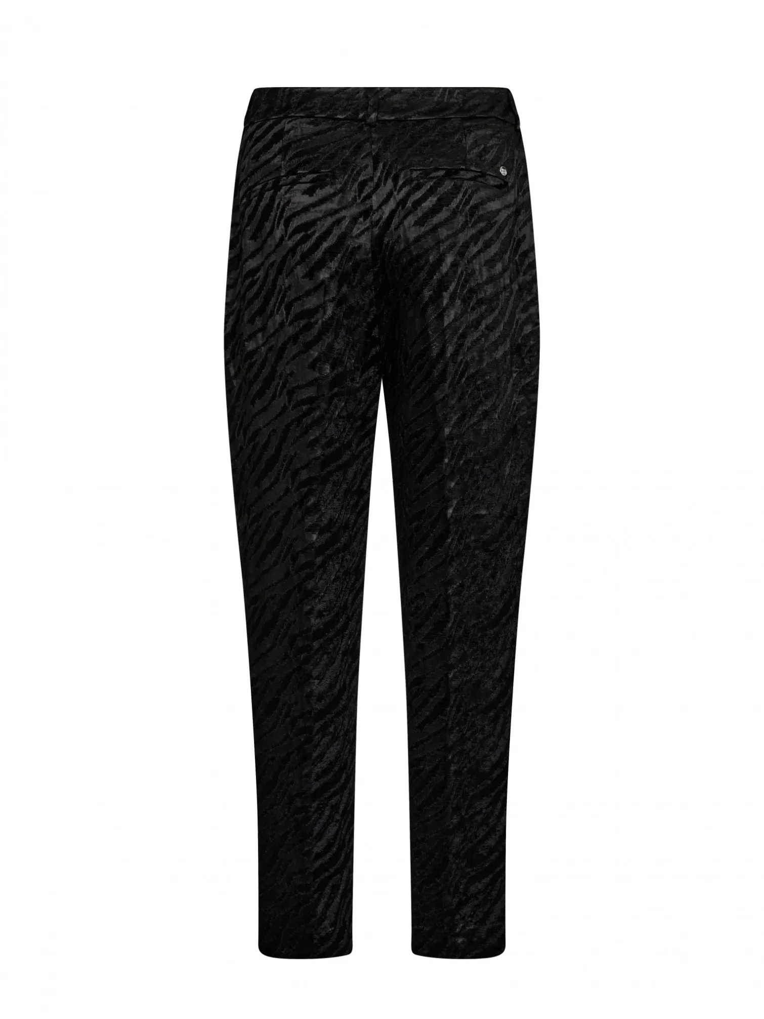 Pants Audey Rizi from Mos Mosh. A pair of suit trousers in black patterned jaquard that gives a subtle beautiful detail. Dsigned with ankel lenght and a tapered leg end. Style with boots and a crispy shirt for a dressed look!