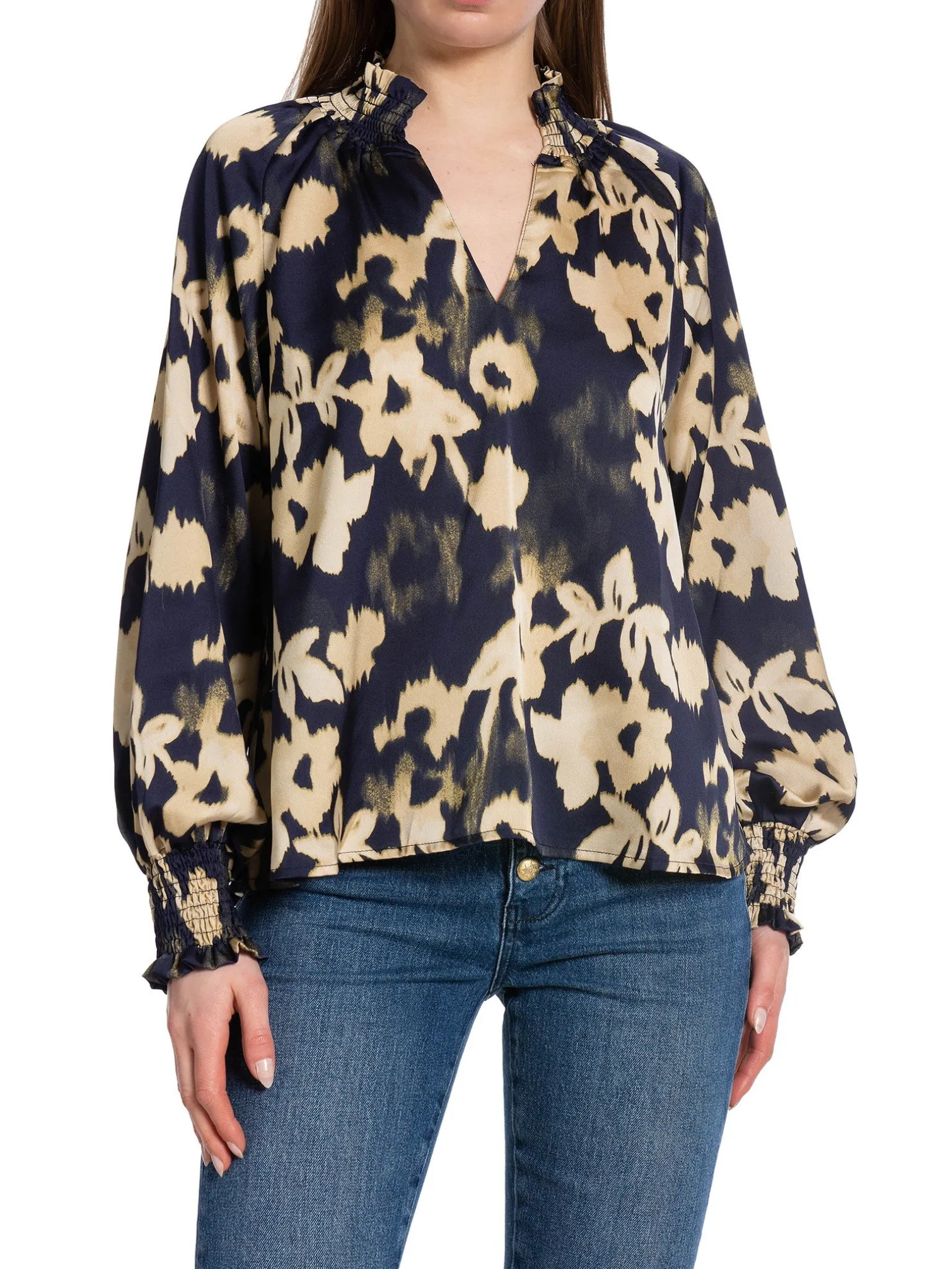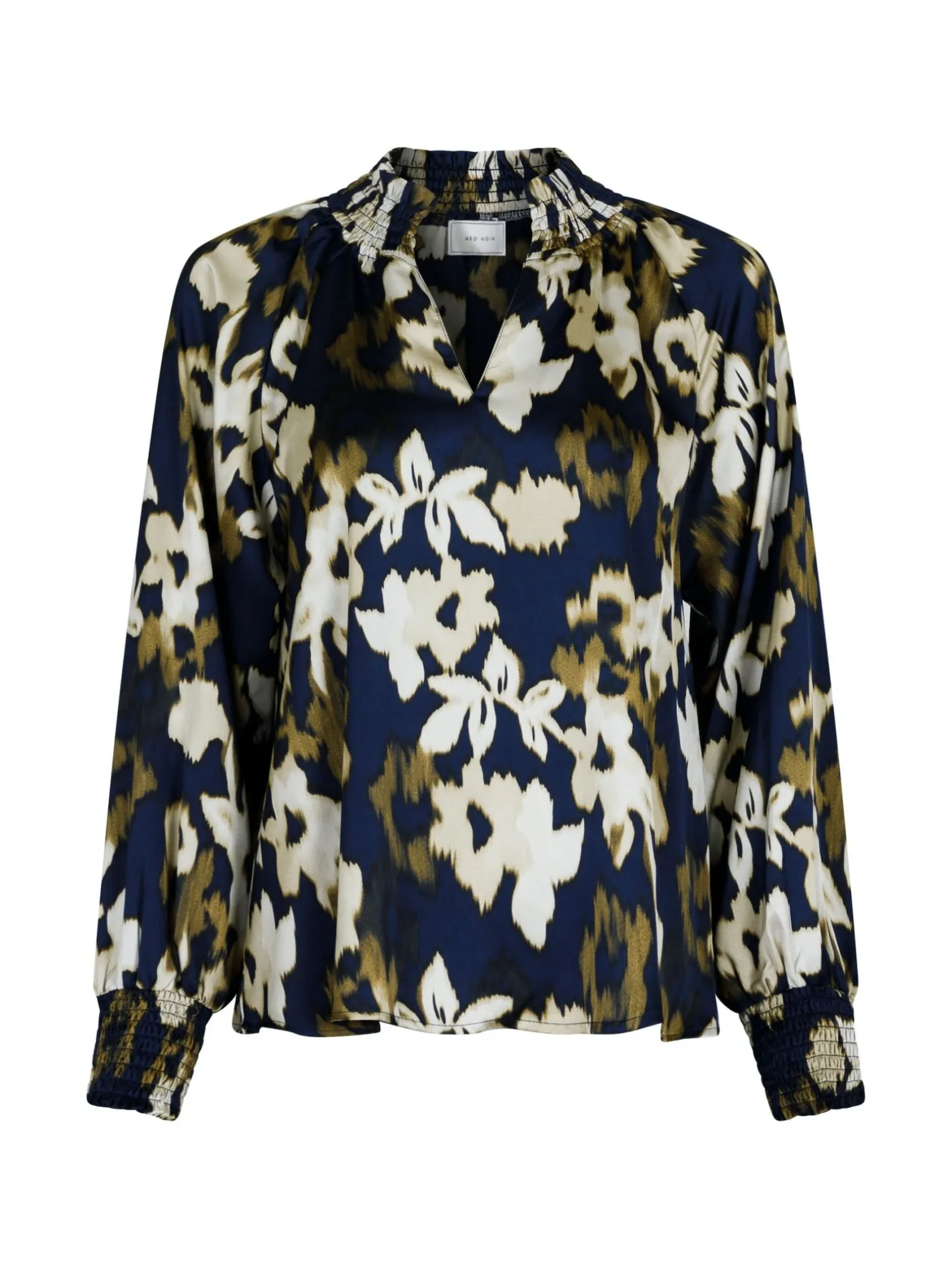 Blouse Stone from Neo Noir. A lovely blouse with smock details. Designed with long sleeves and a lovely printed fabric with a navy blue color. Wear together with denim or a skirt!
