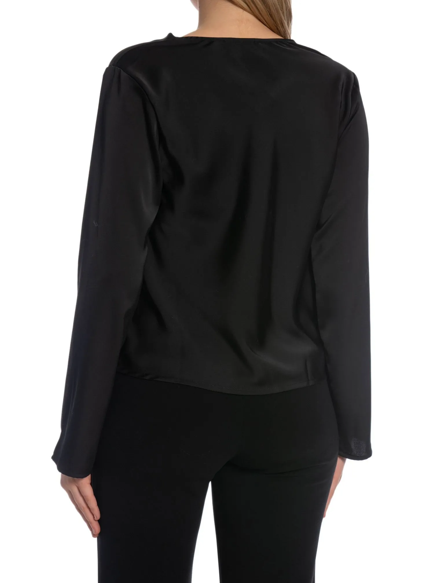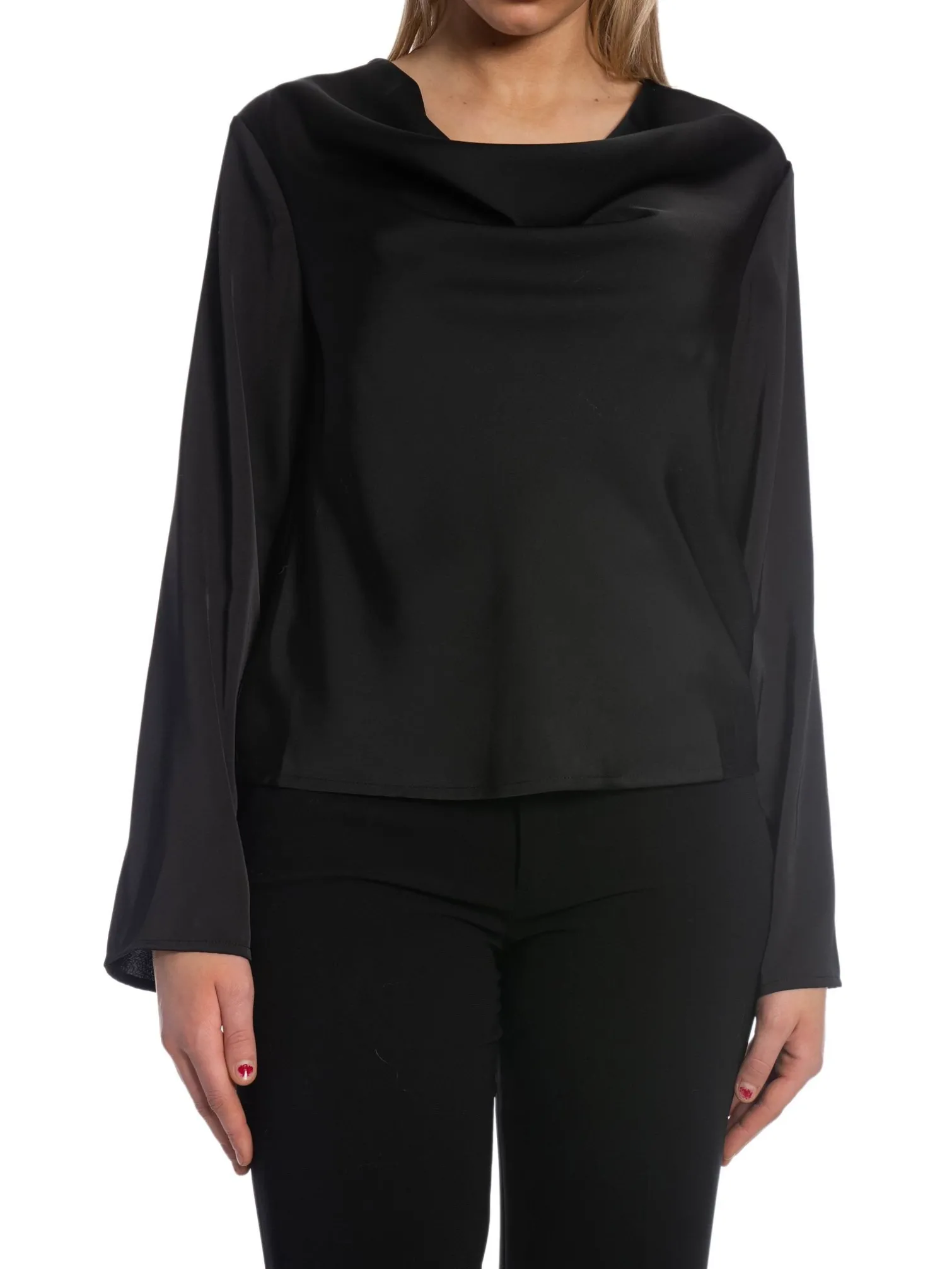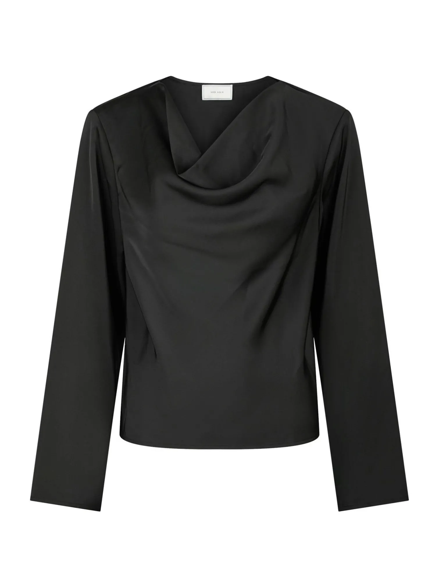 Blouse Vallista Soft Satin from Neo Noir. Fancy blouse with draping at the neckline and flared sleeves. Stylish to match with the Vicky Black skirt from Neo Noir for a complete set.