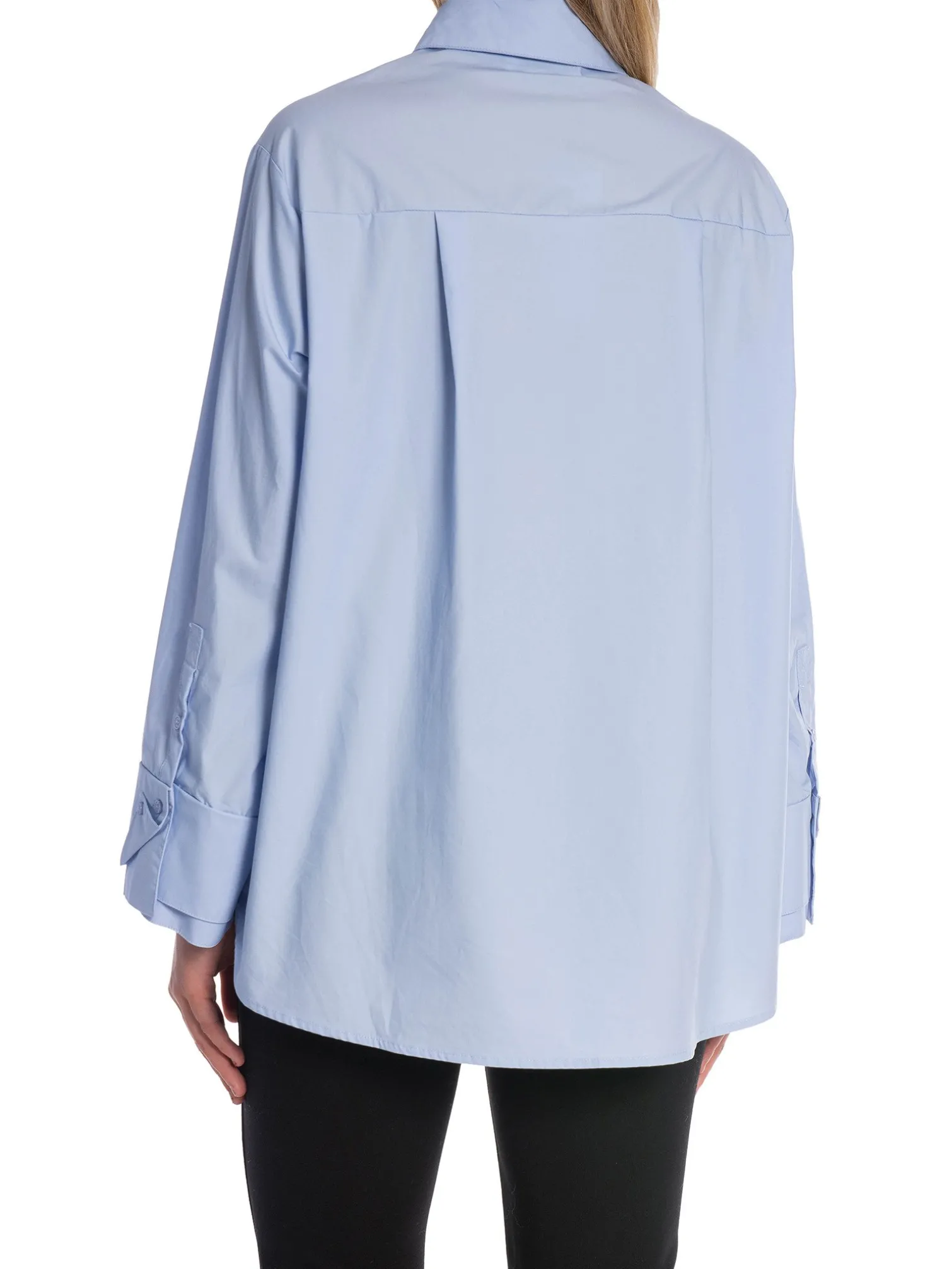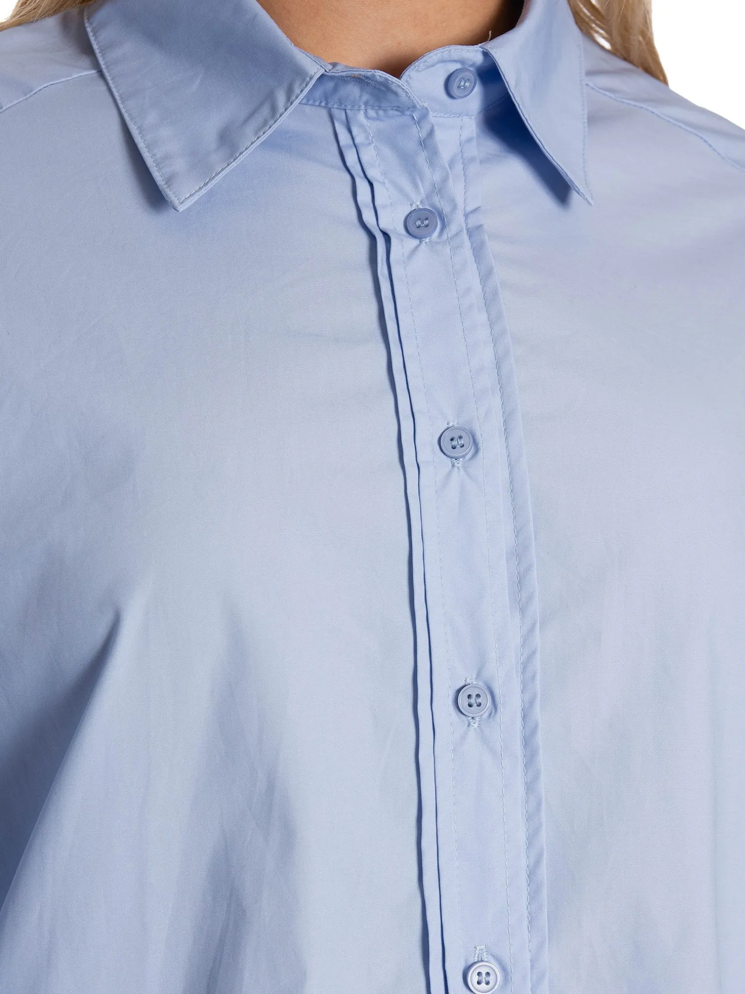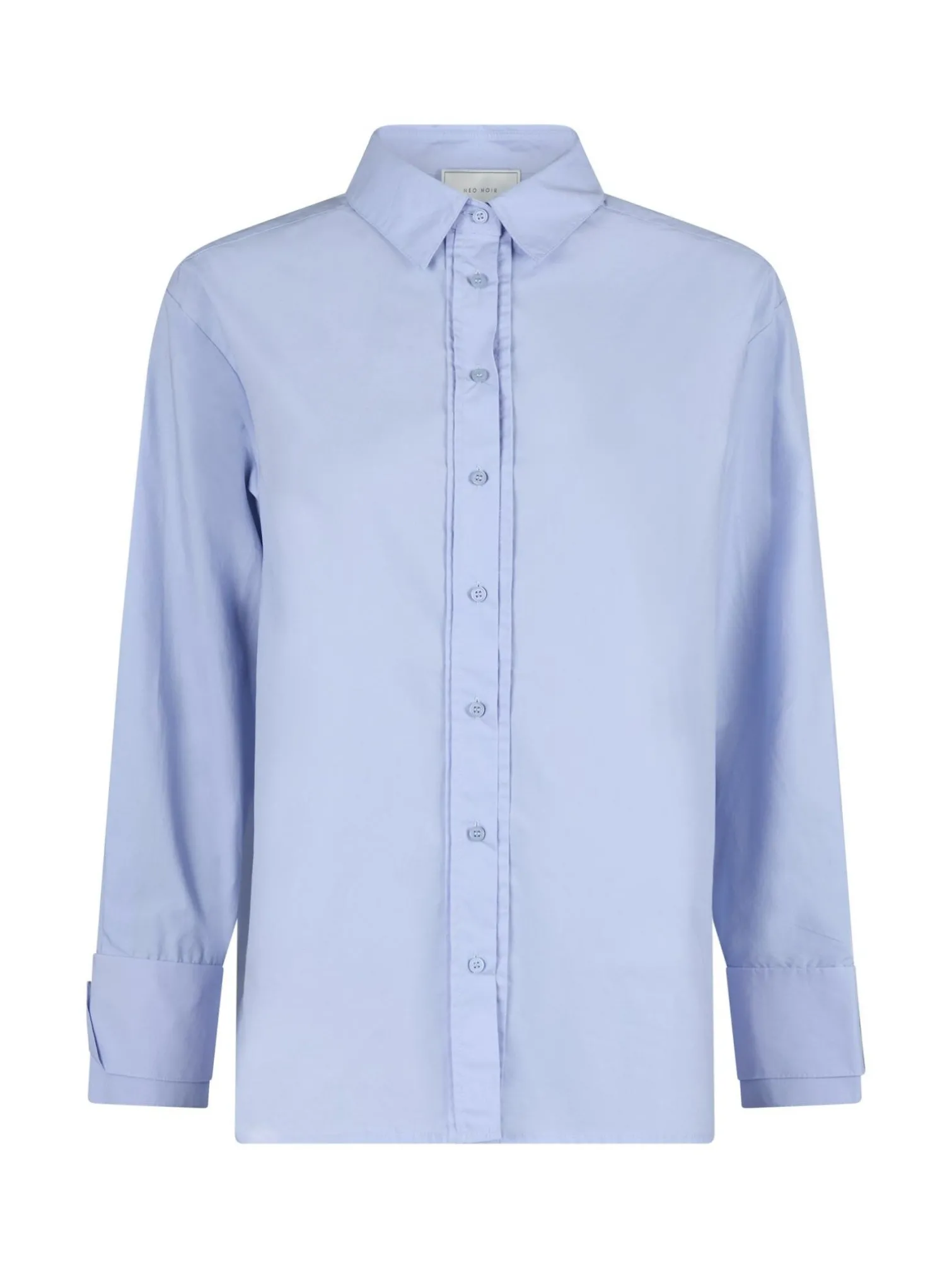 Shirt Hesther from Neo Noir. A lovely cotton shirt in light blue. Sewn pleats at the front of the button for a subtle detail. Slightly wide sleeves and an oversized fit.