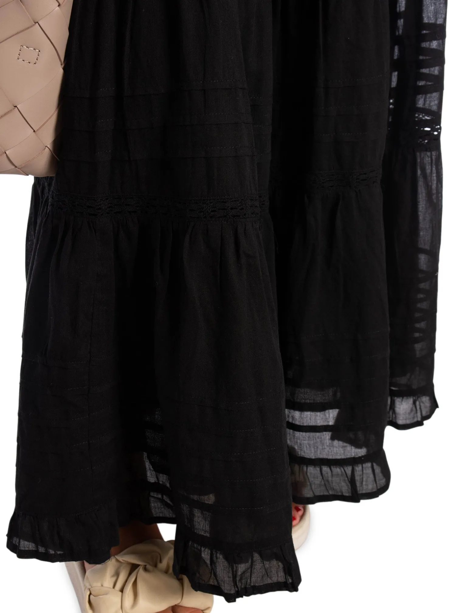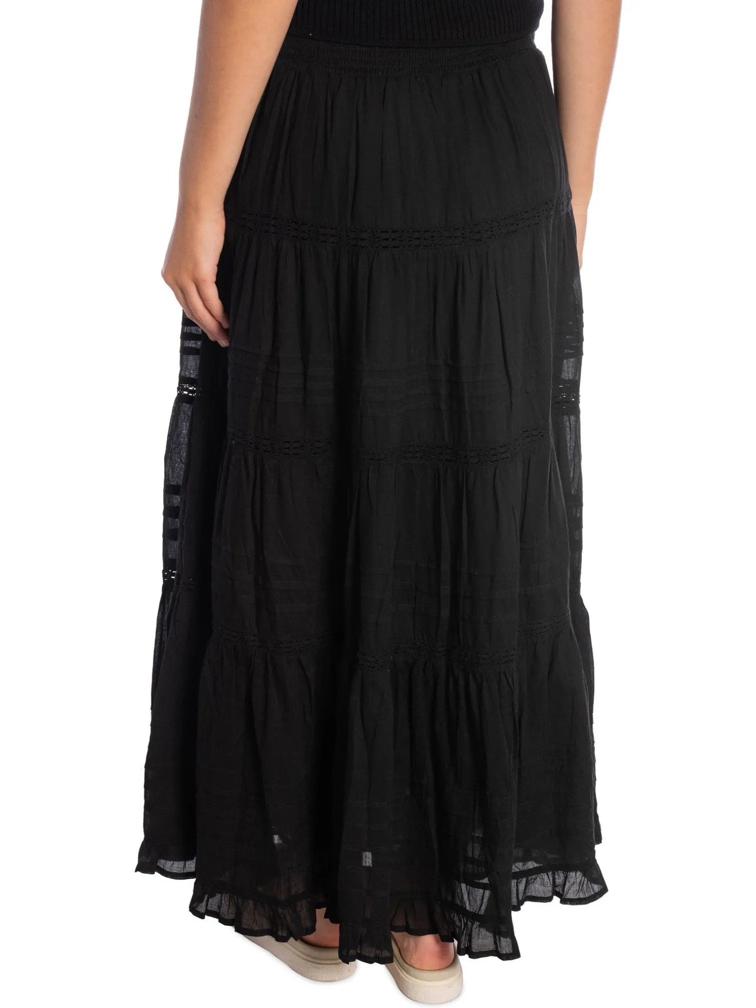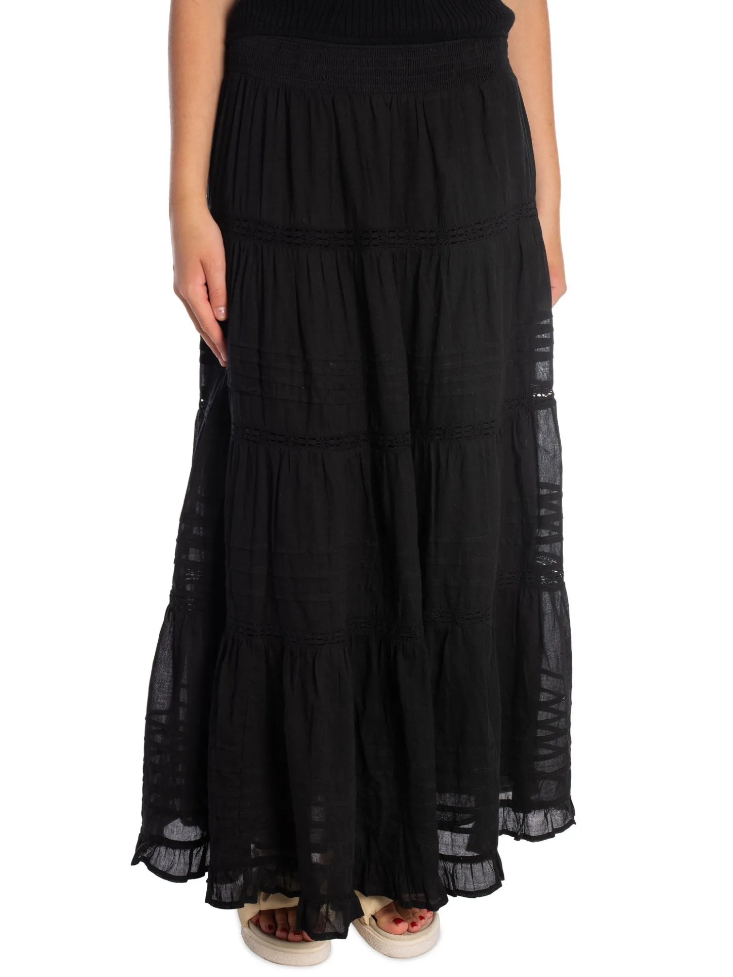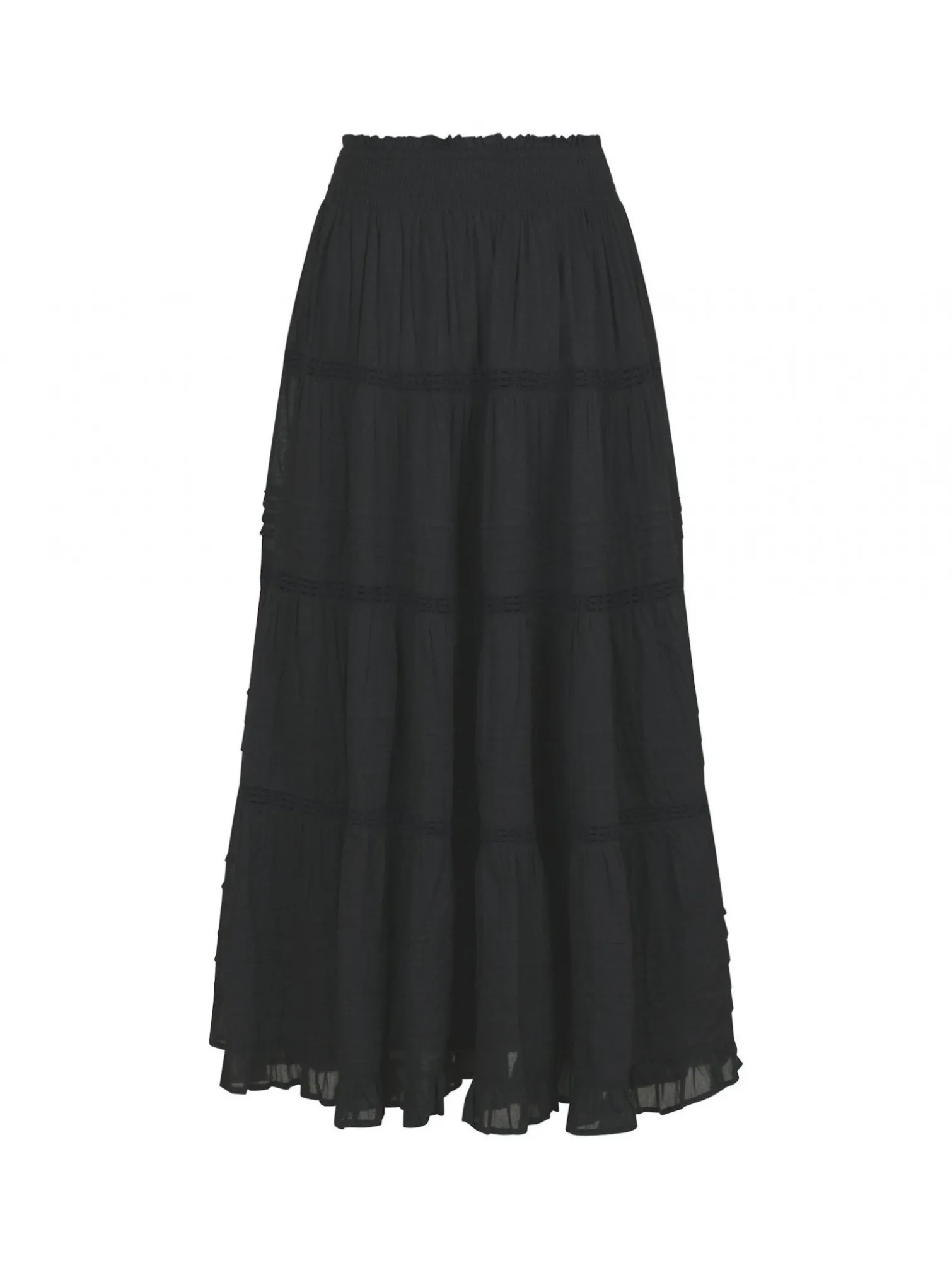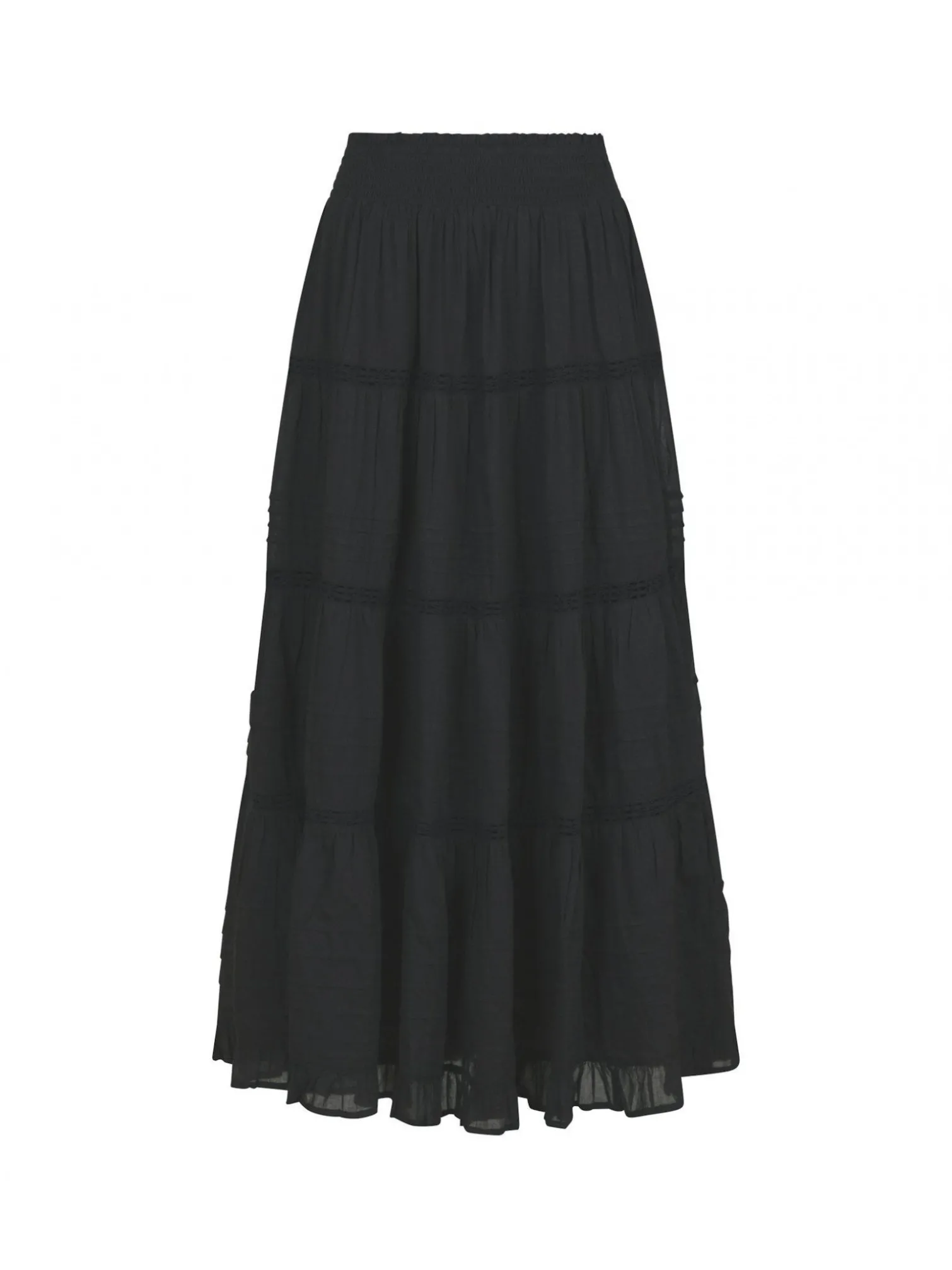 Skirt Felicia S Voile from Neo Noir. A cute maxi skirt in 100% recycled cotton. Detailed in an A-shaped model and with fine lace details. The skirt has a wide smocked elastic at the waist for a comfortable fit and a cute ruffle edge at the bottom of the skirt. A perfect skirt to use on warm summer days together with a nice top!