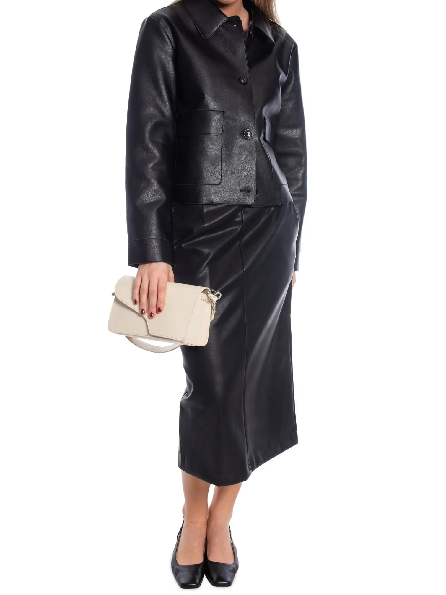 Skirt Nettie Faux Leather from Neo Noir. A stylish pencil skirt in imitation leather, with slits at the back and pleats at the waist. It closes with a hidden zipper at the back. Perfect to dress up or down, with either a shirt or a knit sweater.