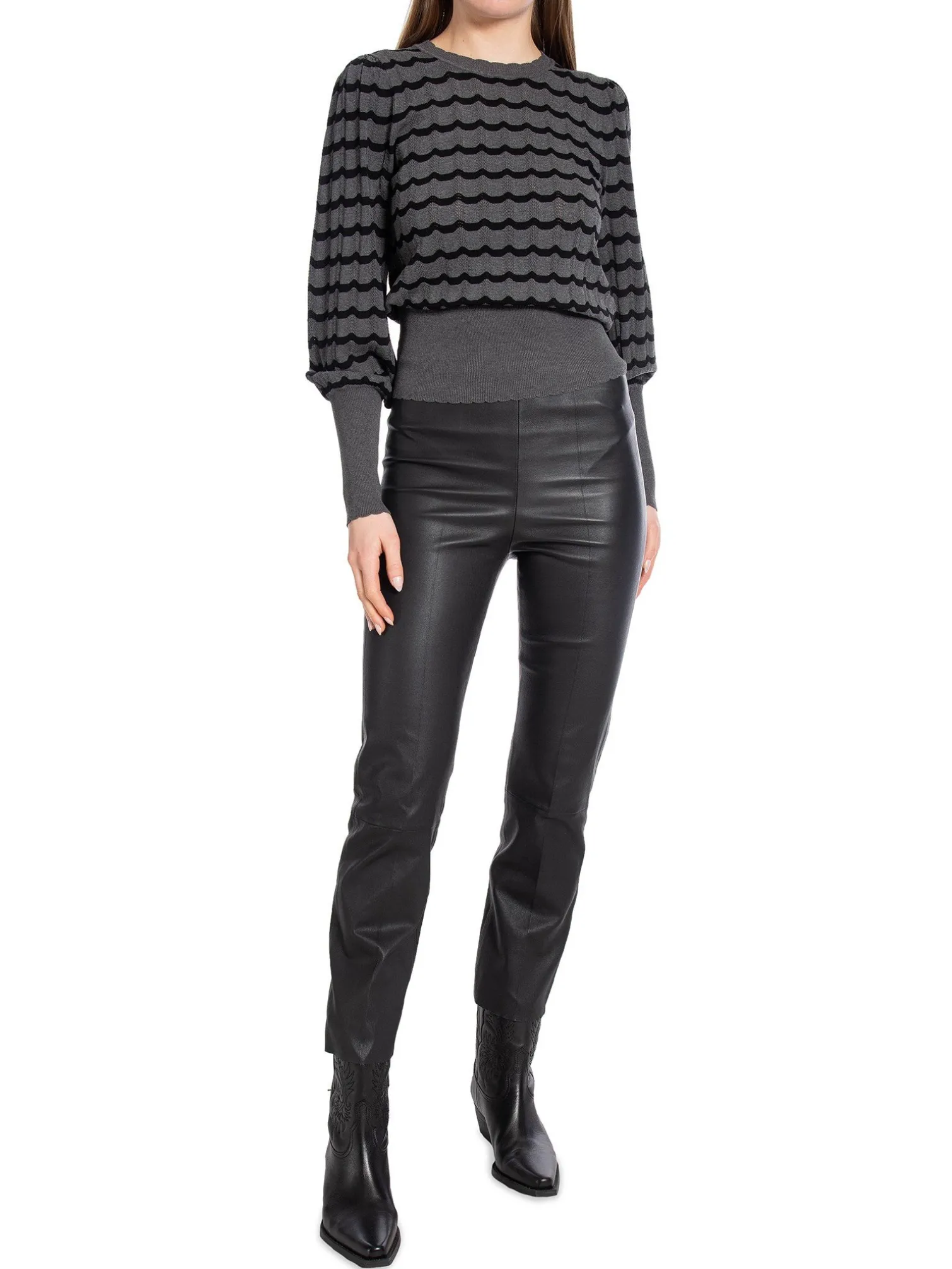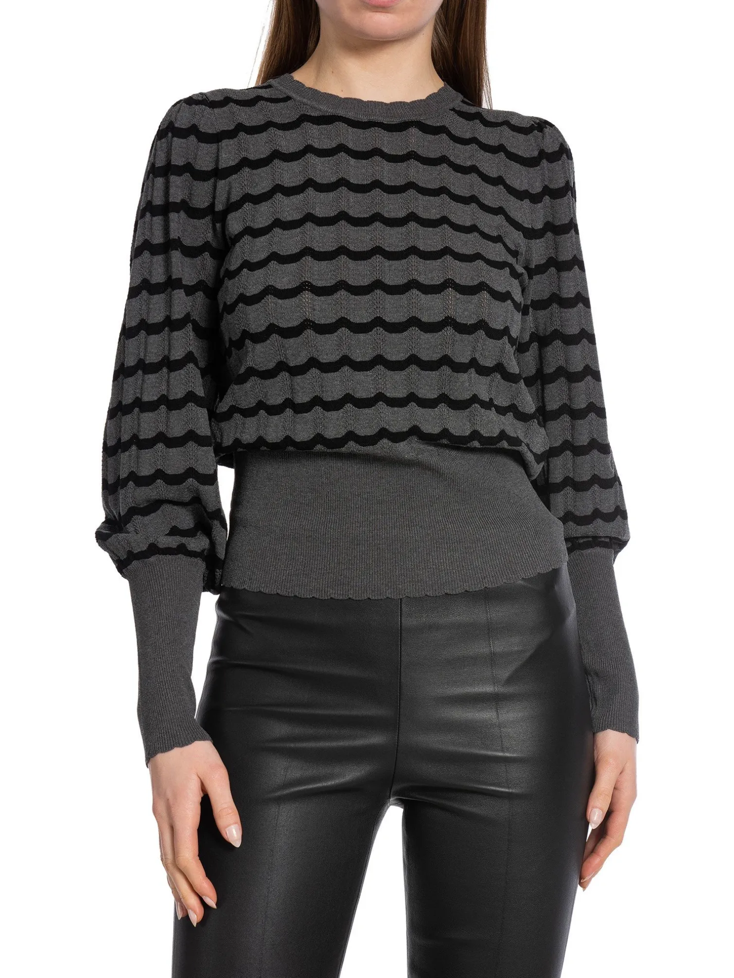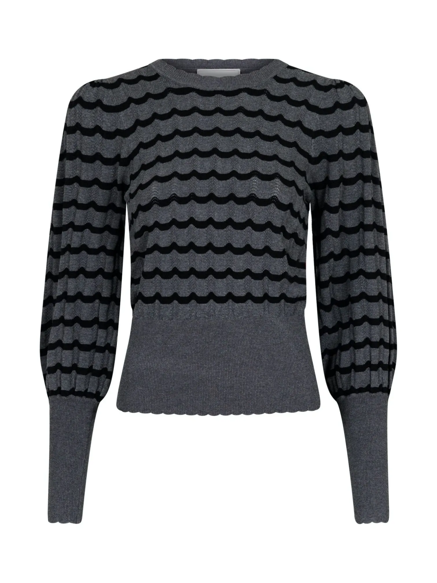 Blouse Dary from Neo Noir. A gray striped knitted blouse with a longer cuff at the waist and sleeves. The perfect top to wear with both denim and leather pants!