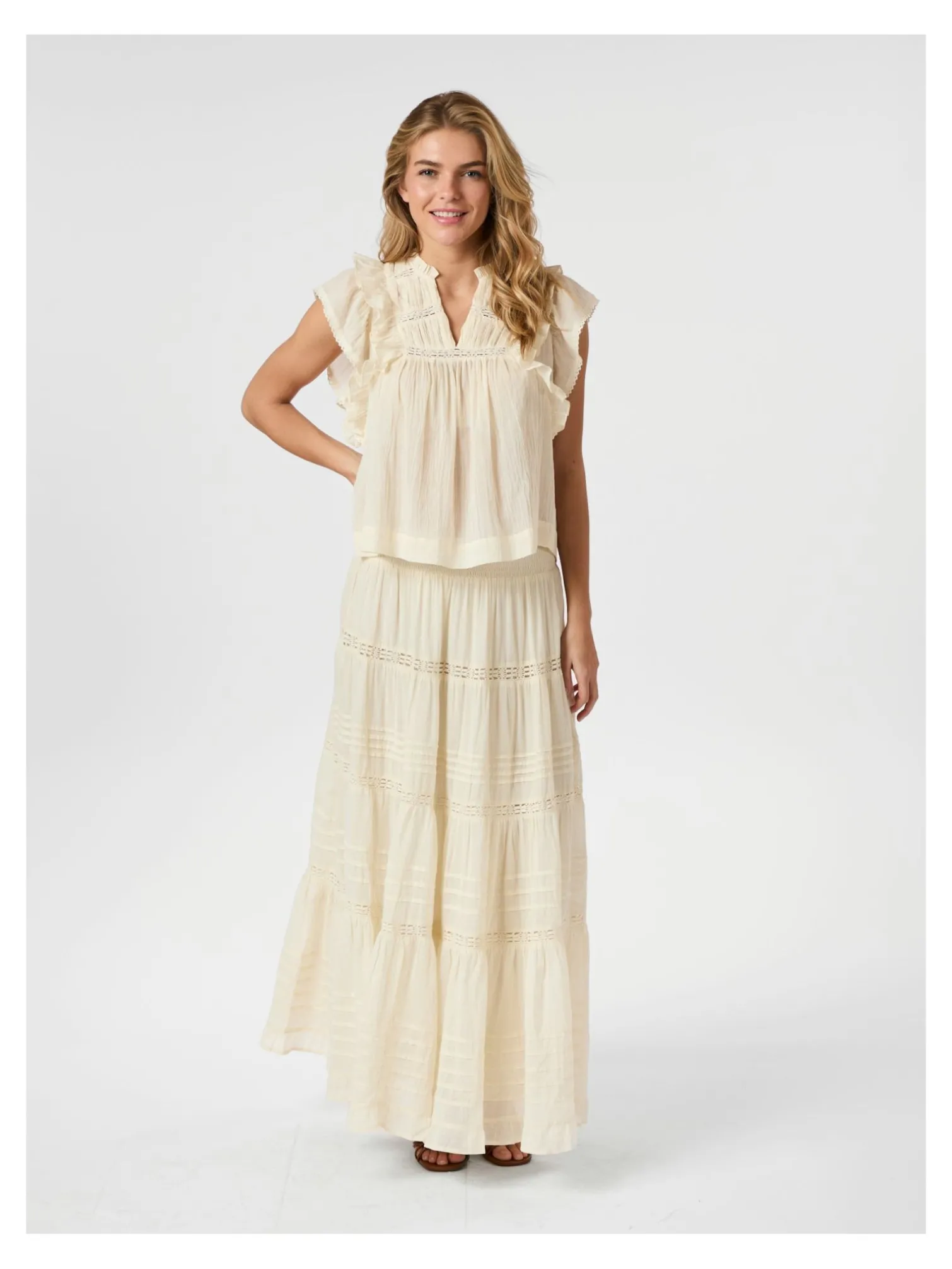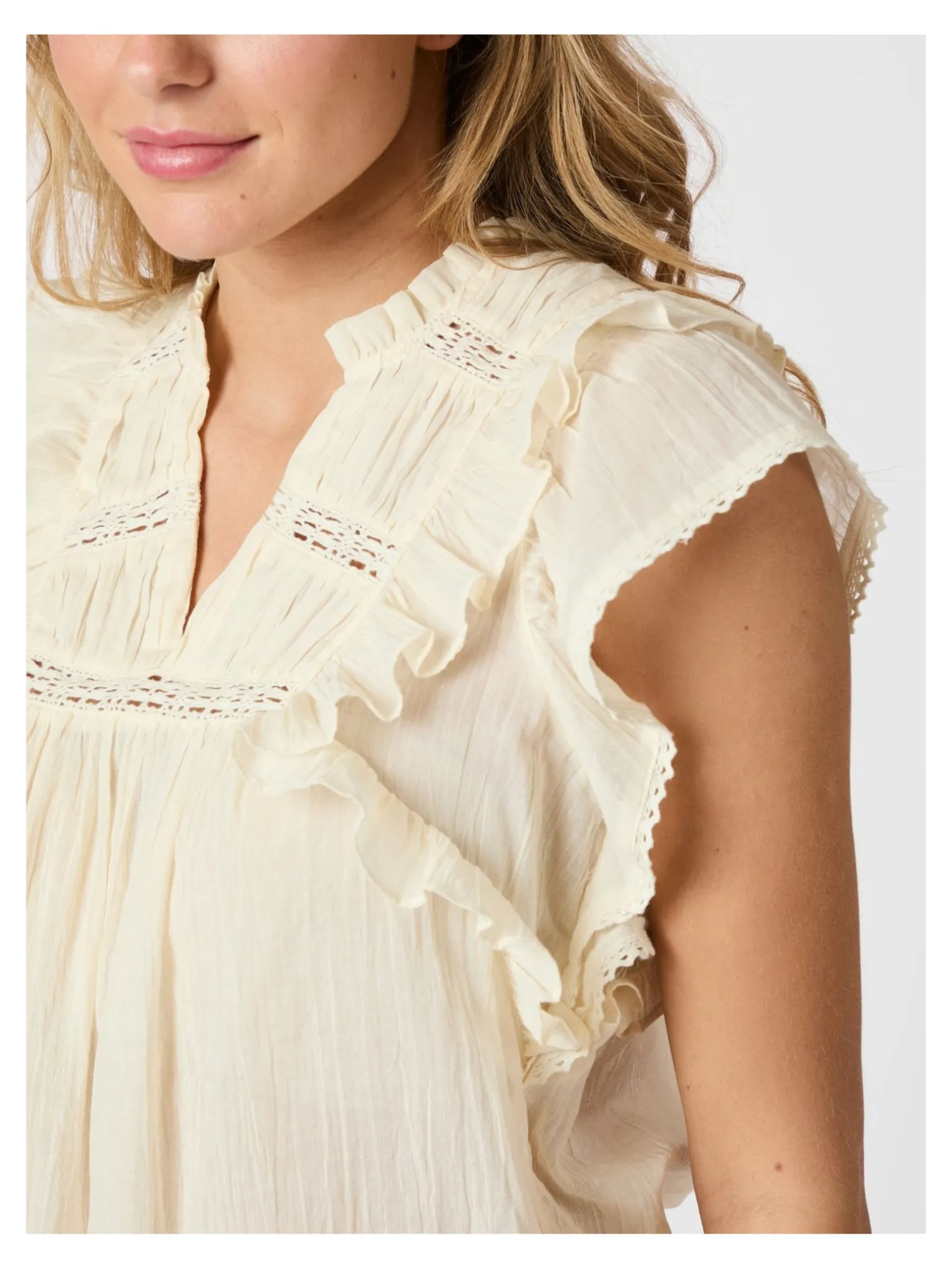 Top Jayla from Neo Noir. Feminine sleeveless top with lots of details, lace and ruffles. Loose and comfortable fit, but with a light and flattering silhouette.