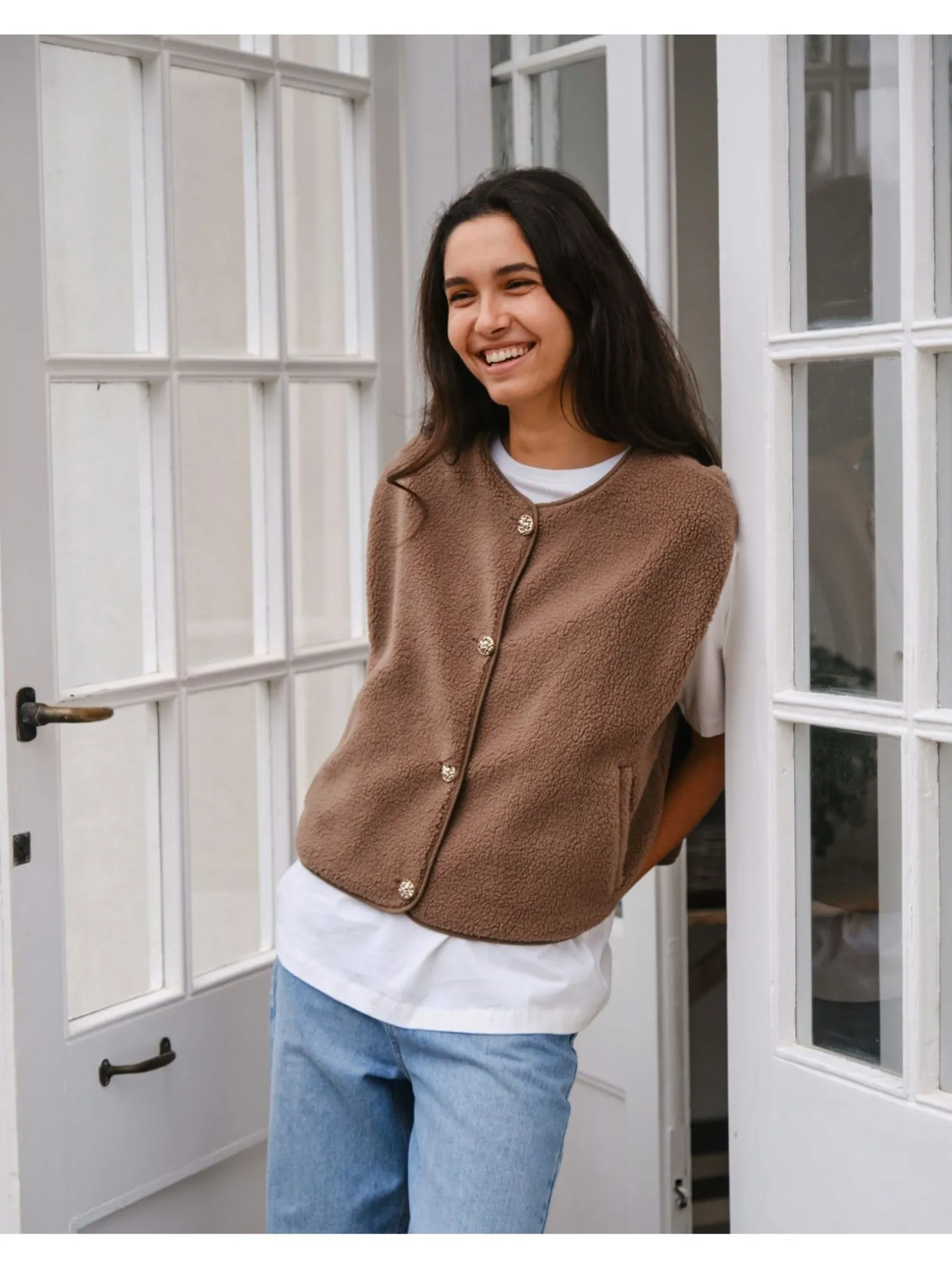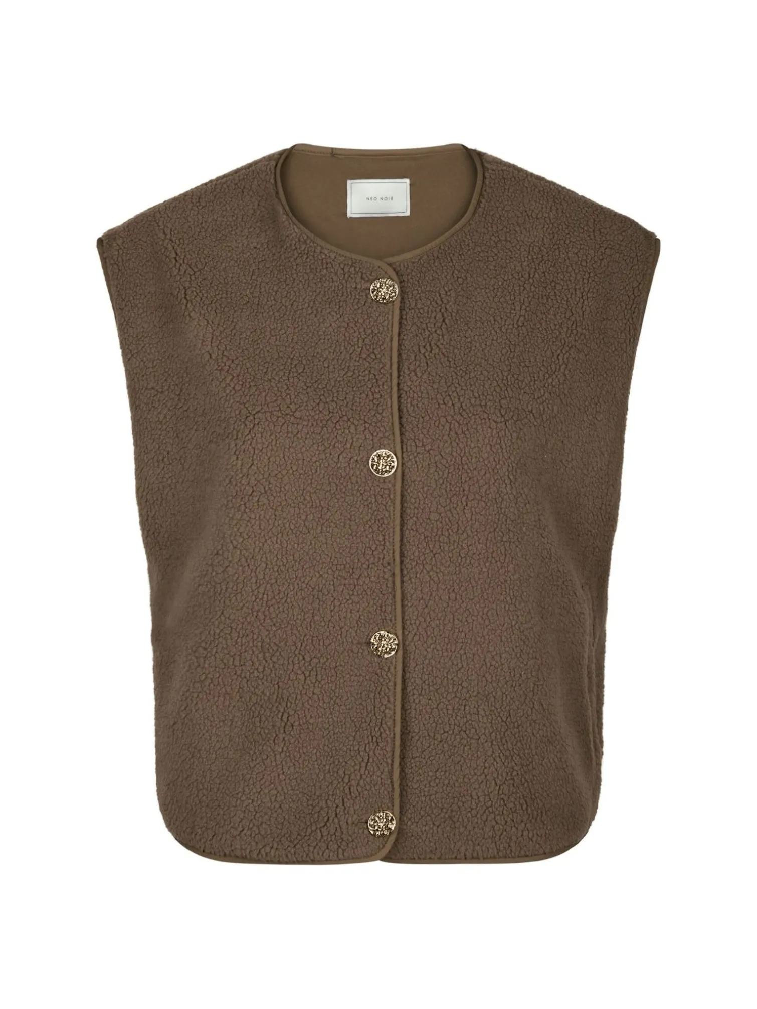 Väst Mariko from Neo Noir. A stylish teddy vest based on the best-selling cardigan Limo. Designed with a slightly boxy fit and gold buttons at the front. Teddy material on the surface and a smooth inside. Style over your shirt, t-shirt or fine-knit turtleneck for a warming, stylish look! The perfect extra layer to add under your spring jacket as well!