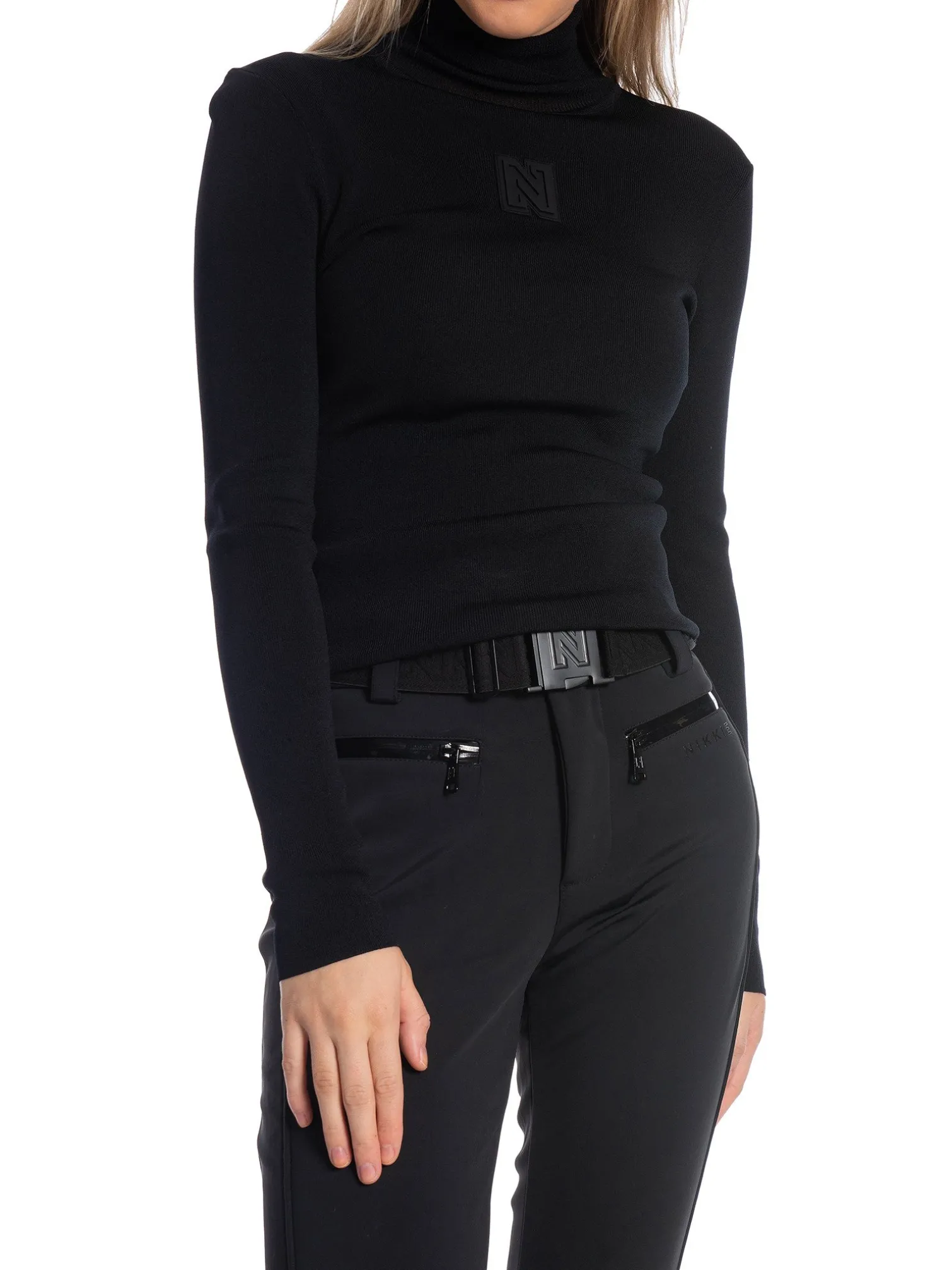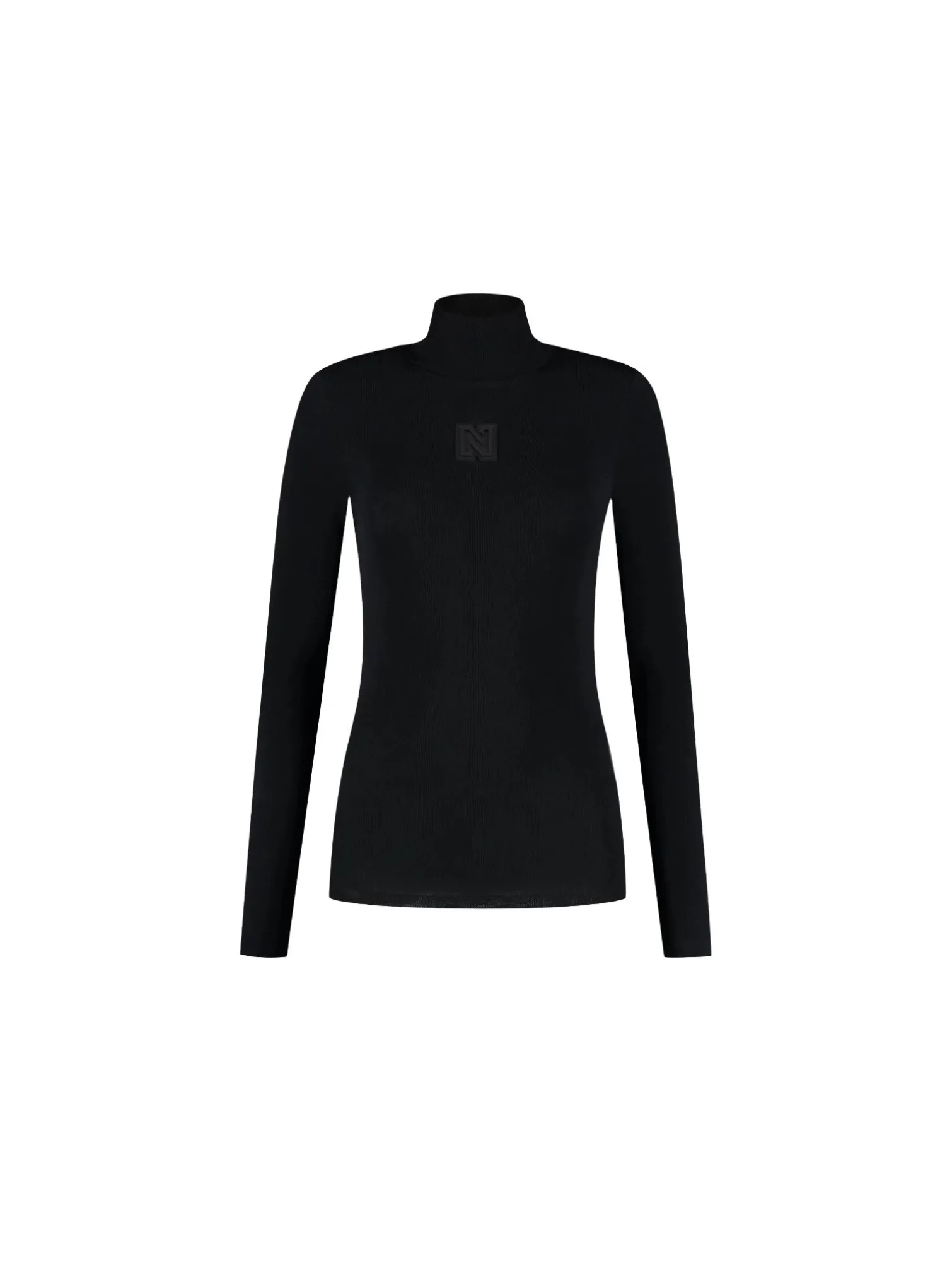 Jumper Jolie Ski Turtle Neck from NIKKIE. A knitted viscose blend polo shirt. Designed with contrast knitting on the collar, decorative rubber logo on the chest and a close fit. Just as stylish for everyday use as for afterskin!
