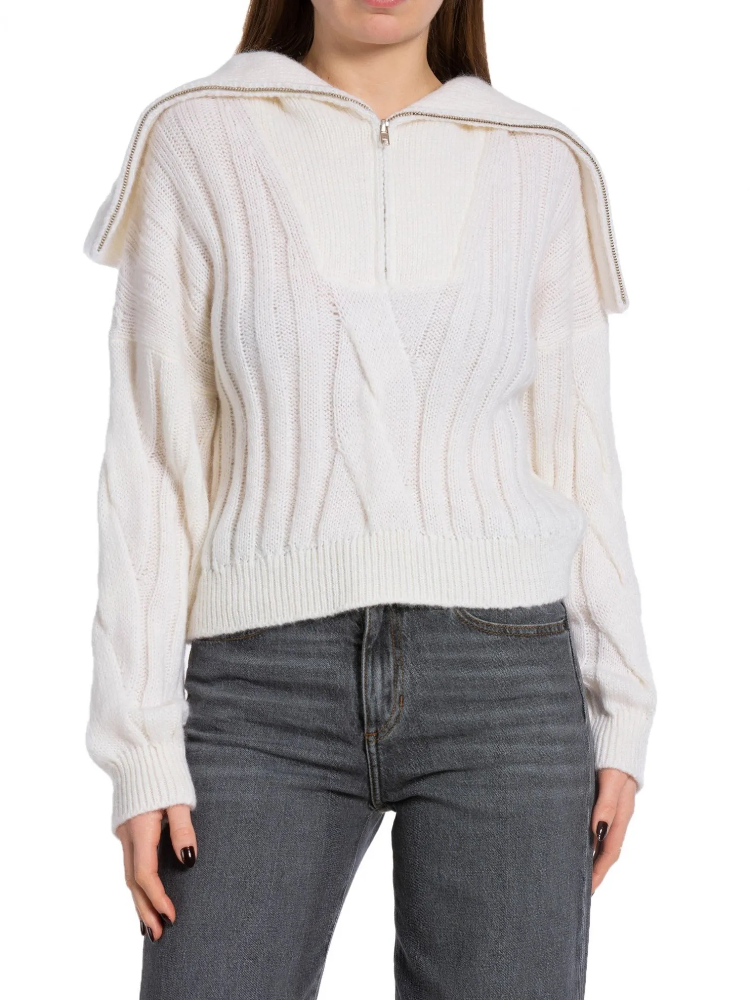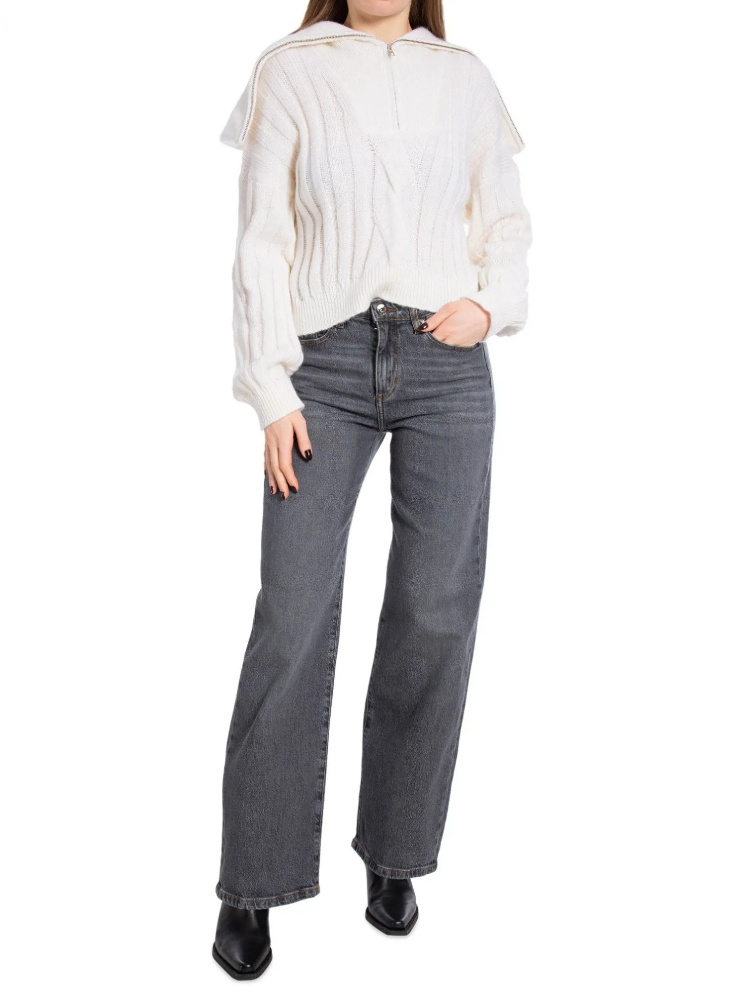 Alexa sweater from Rodebjer. A rib knit sweater in a mohair mix with large knitted cable details on the front and on the sleeves, rib knit garment ends, and a large collar with a silver zipper. Wear the sweater with a leather skirt and boots for a modern look!
