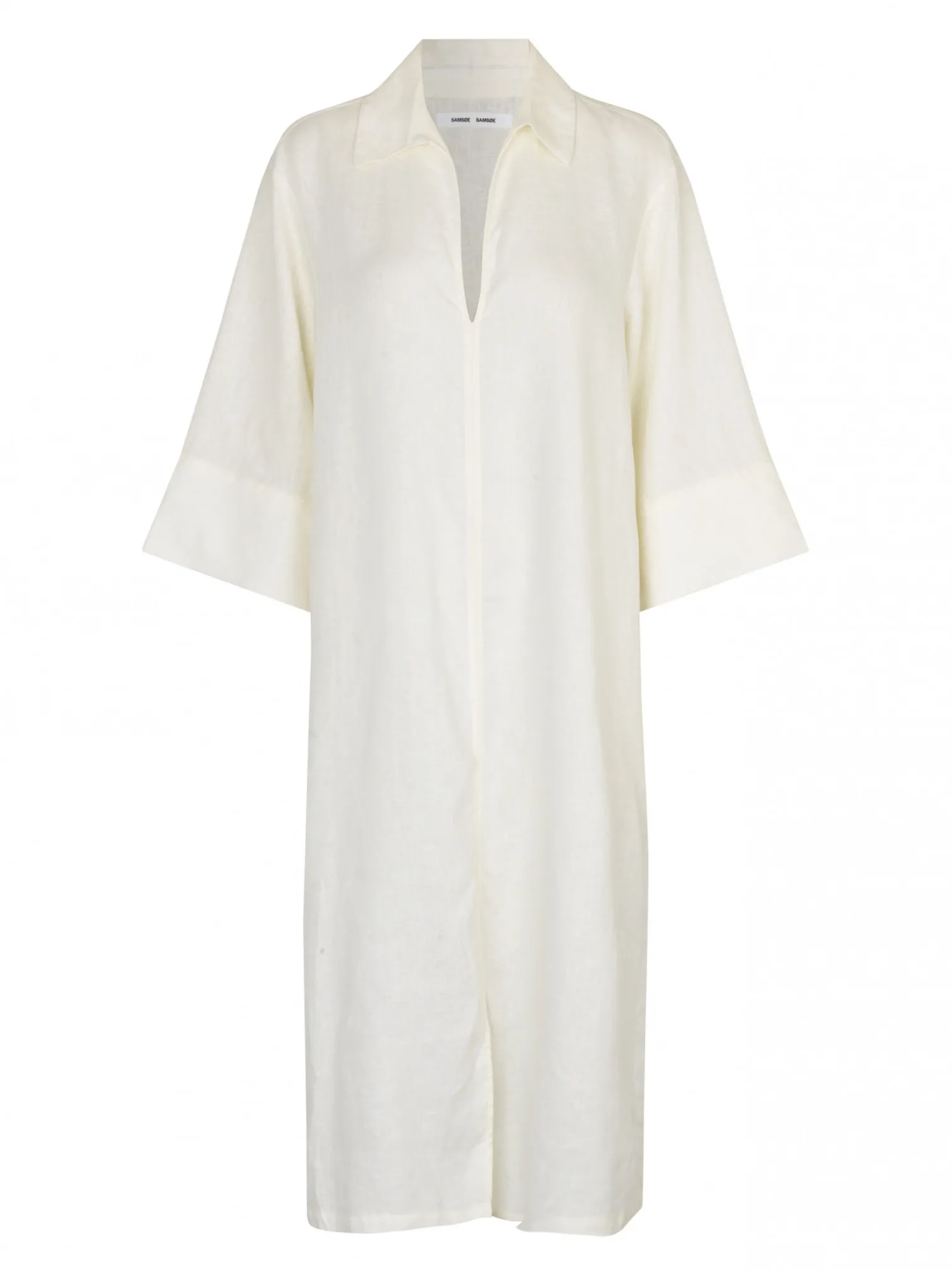 Dress Saalle from Samsoe Samsoe. A lovely dress in 100% Linen. Designed with a shirt collar and V-neckline, wide 3/4 sleeves and a slit at the bottom. Style together with a pair of nice sandals for a nice and relaxed look!