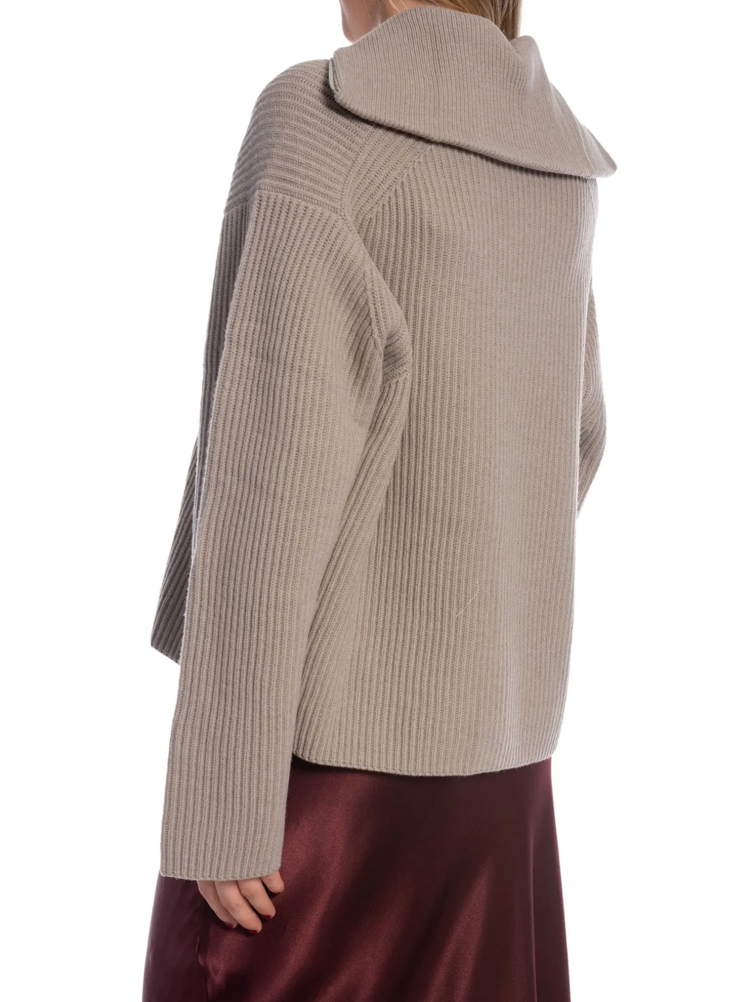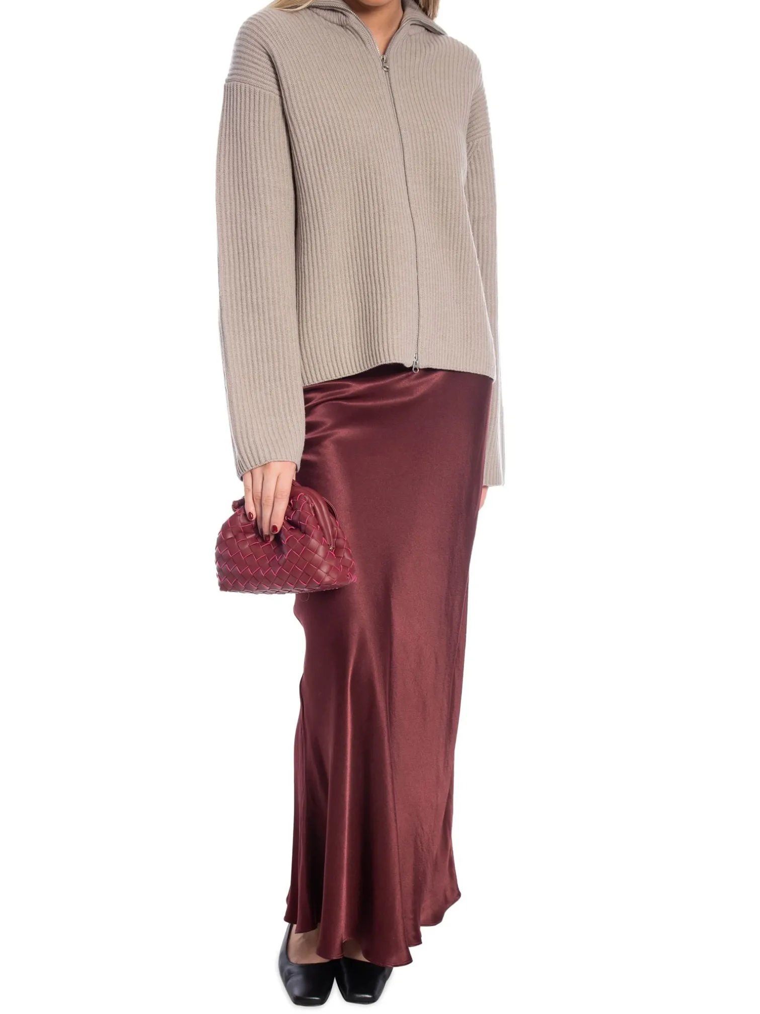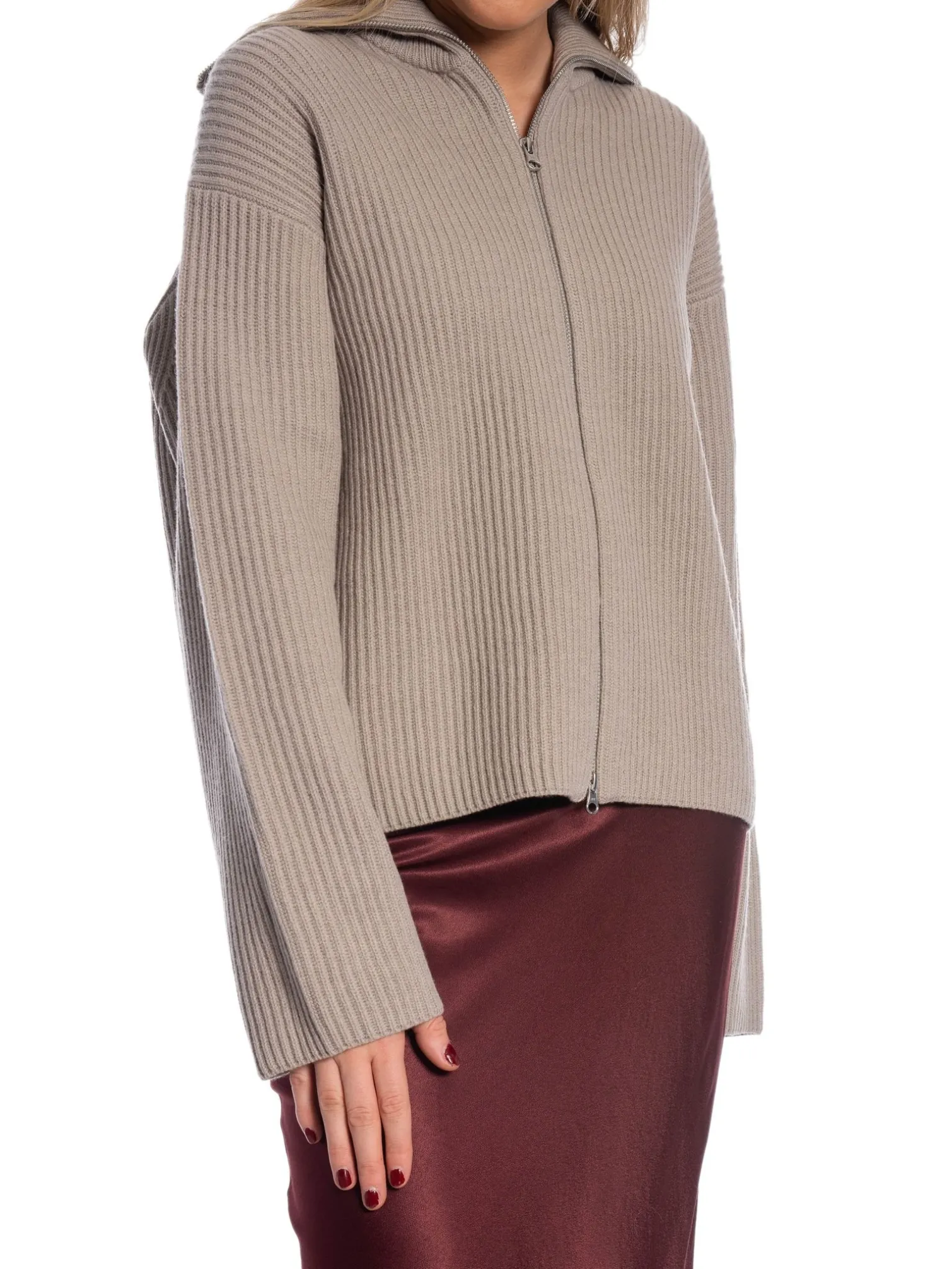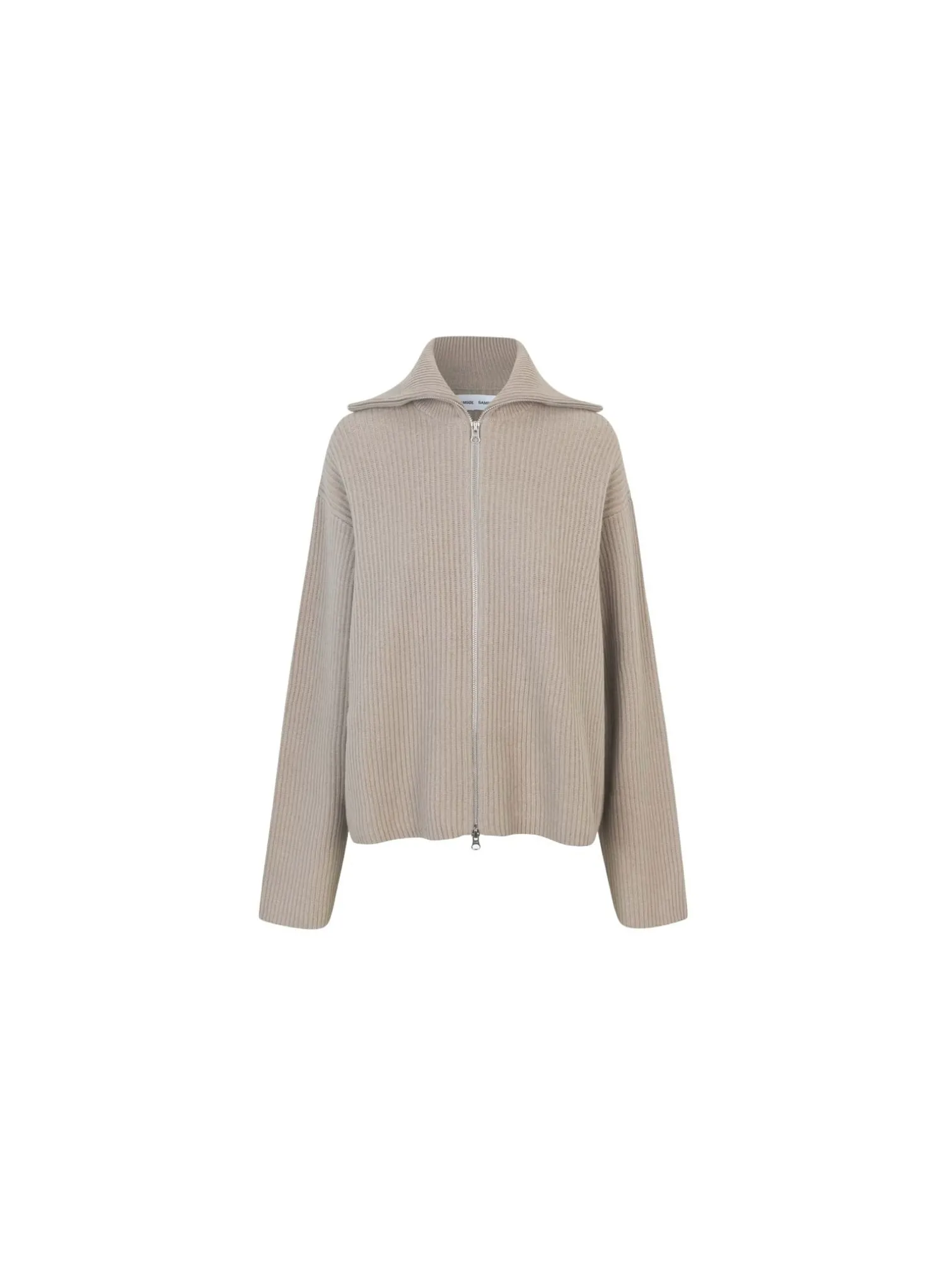 Cardigan Nova from Samsøe Samsøe. Cozy cardigan with double zipper at the front and collar. The sweater is in a grey-beige shade and has slightly longer sleeves.