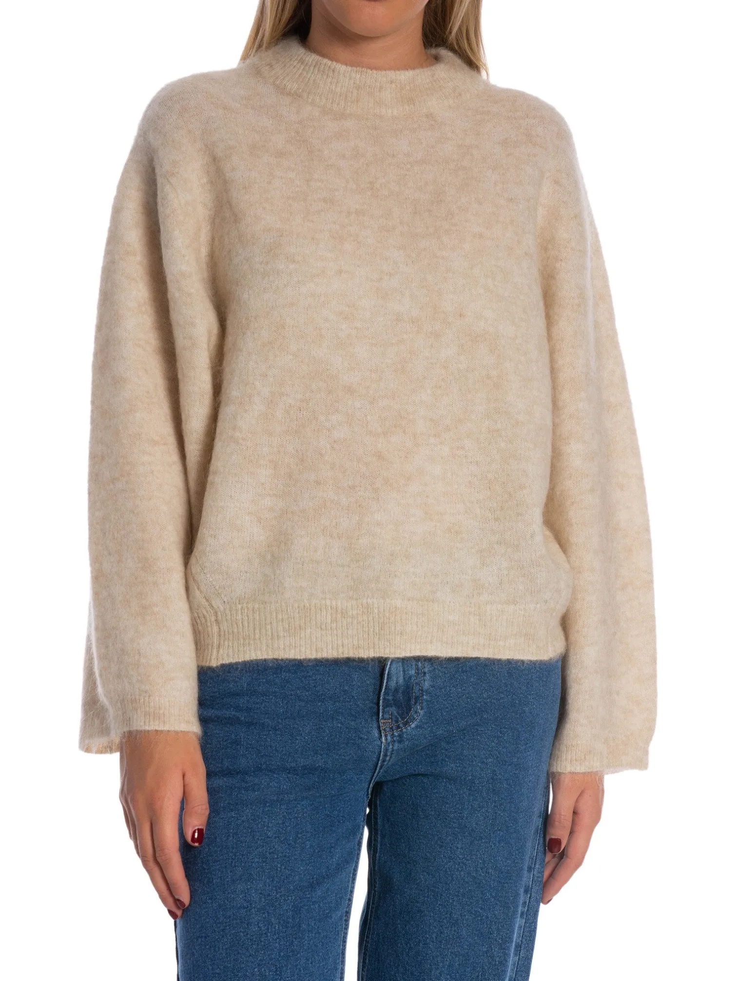 Sweater Anneleen from Second Female. A cozy knitted sweater in wool and mohair – blend. Comes in a perfect beige shade with a rounded neck. Style with a pair of leather pants and boots for a perfect fall look!