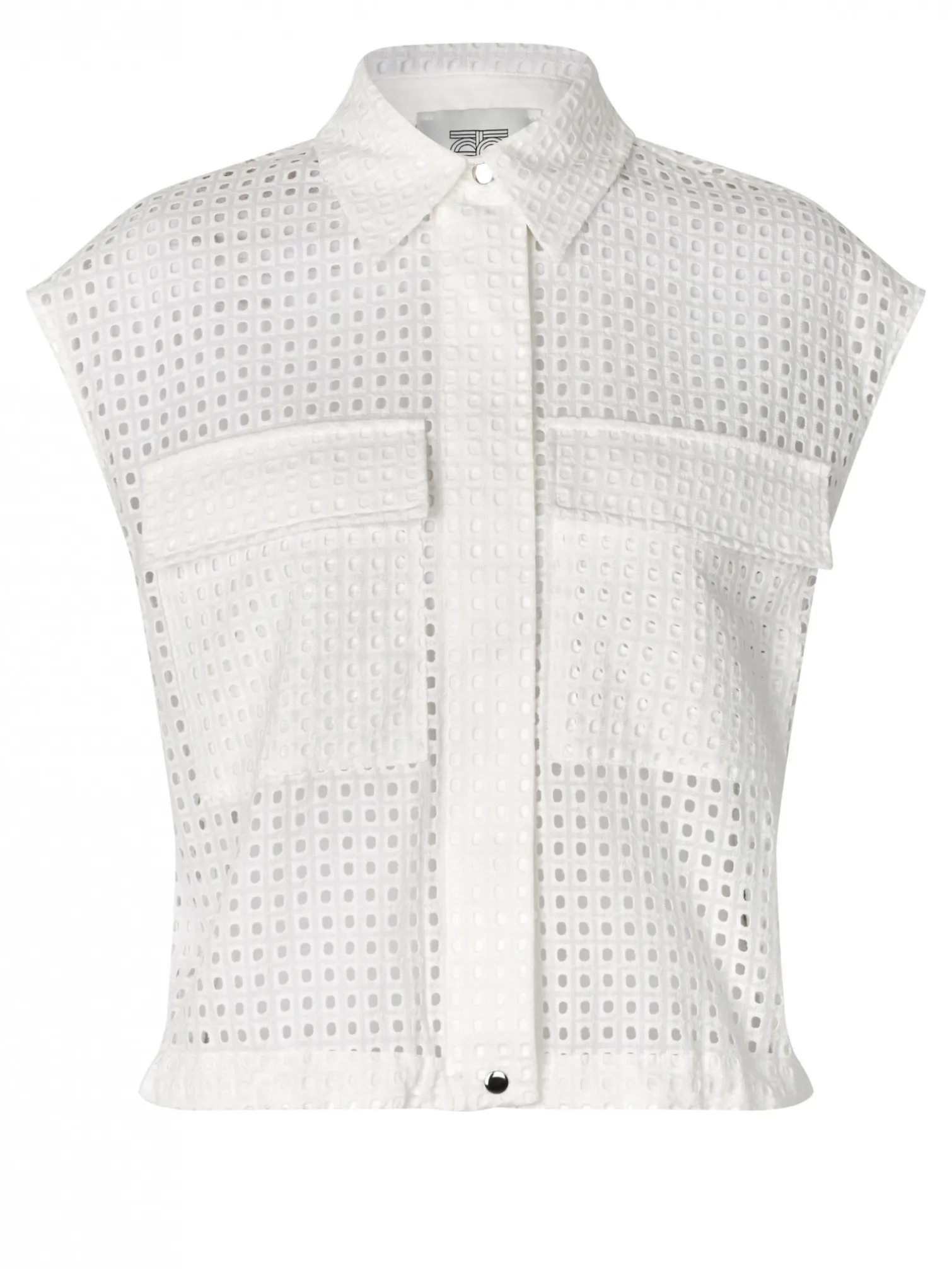 Vest Villa from Second Female. The vest is designed in a hole patterned fabric and closes with hidden buttons at the front. It has two chest pockets and an adjustable elastic at the bottom.