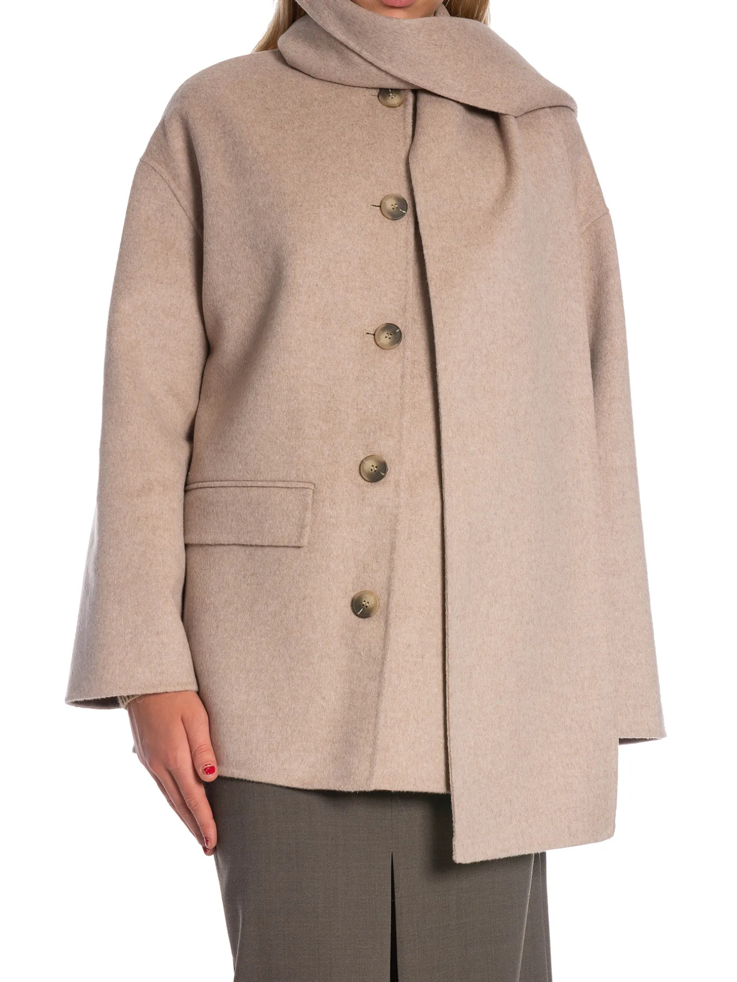 Jacket Pam from Selected Femme. A stylish wool jacket with a built-in scarf that is removable. The scarf is attached to the inside of the jacket with small buttons. The jacket itself is designed in a luxurious unlined design, in a straight fit with button closure at front. A soft warming jacket perfect for the autumn and winter season for those who want to be elegant and stylish!