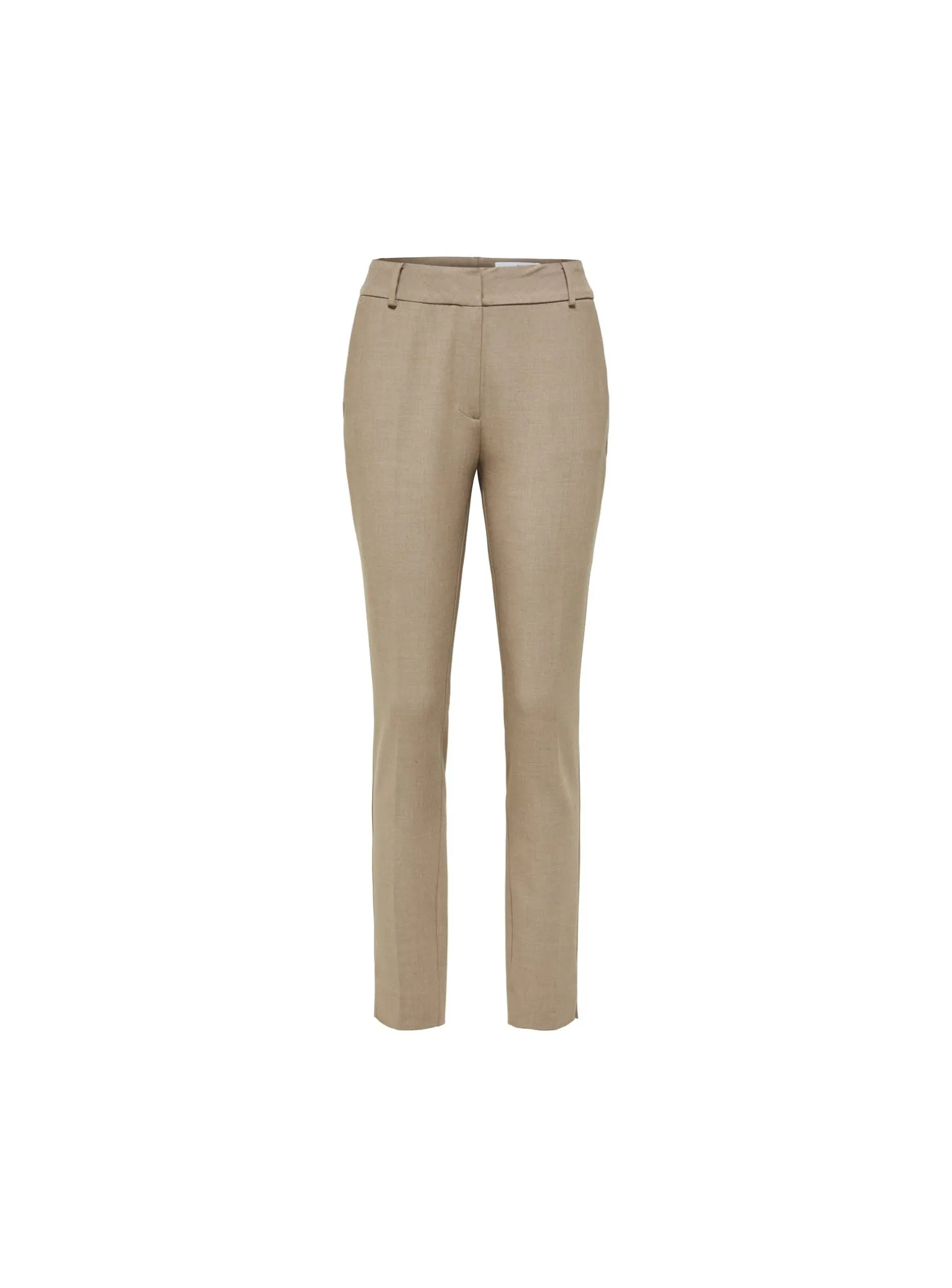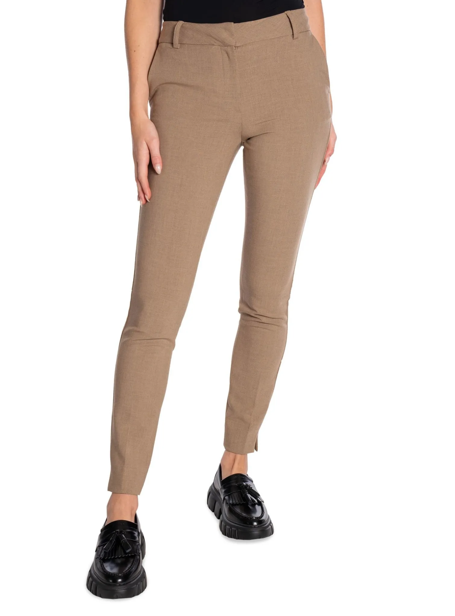 Trousers Slim Rita from Selected Femme. A camel colored simple suit trousers with a hidden zipper at the front, side pockets and a slit at the bottom at each end of the trousers. A straight model that looks good to match with a white simple t-shirt and a pair of sneakers! Or dress up to a blouse and heels!