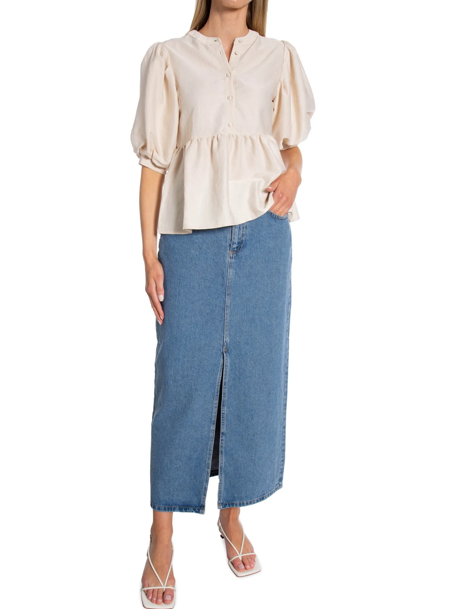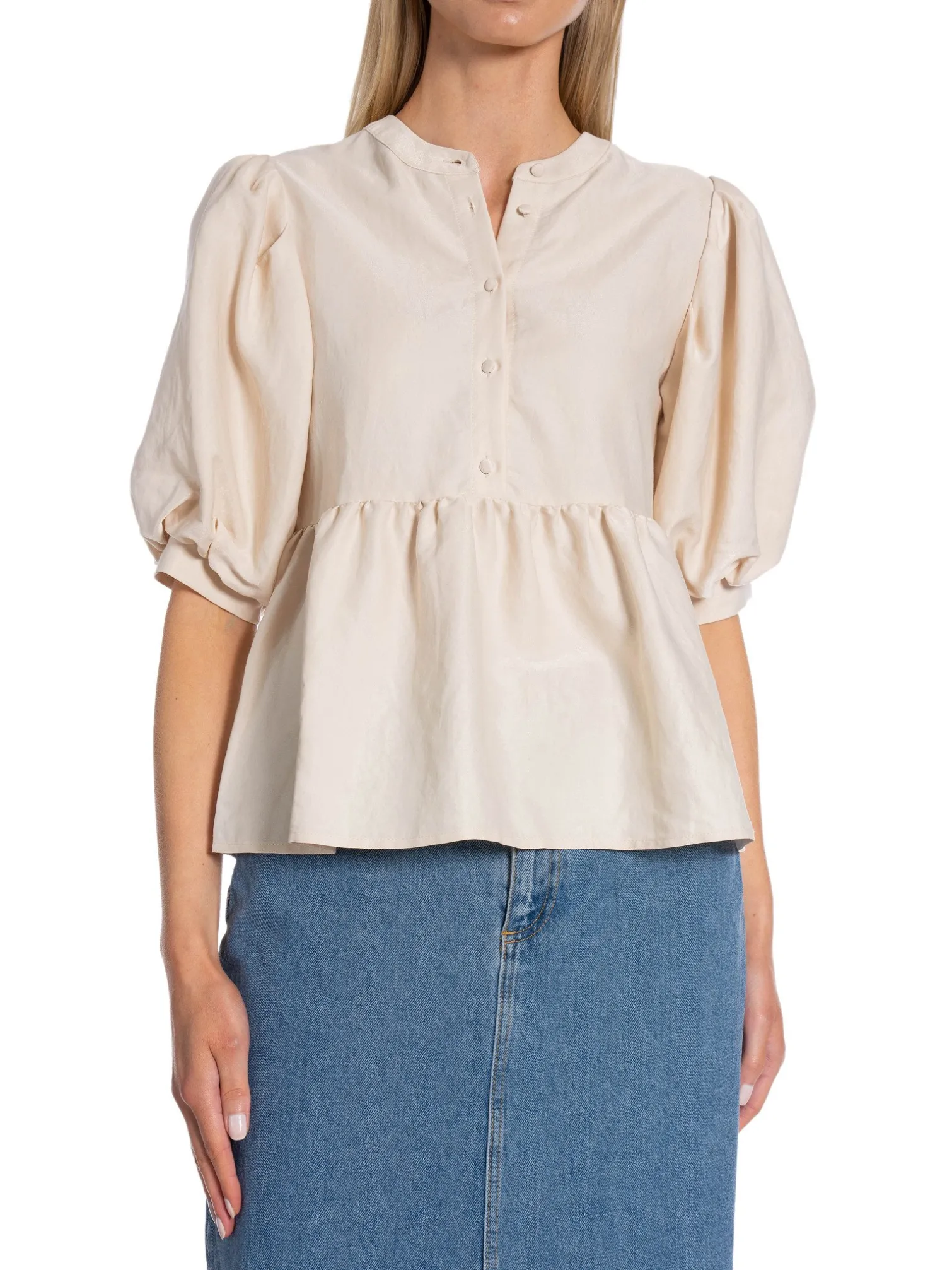 Top Windy from Selected Femme. A luxurious top with puffy short sleeves, a smock at the waist and fabric covered buttons on the front.