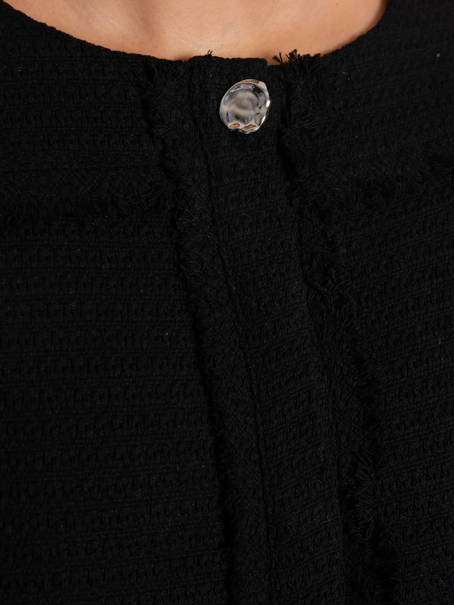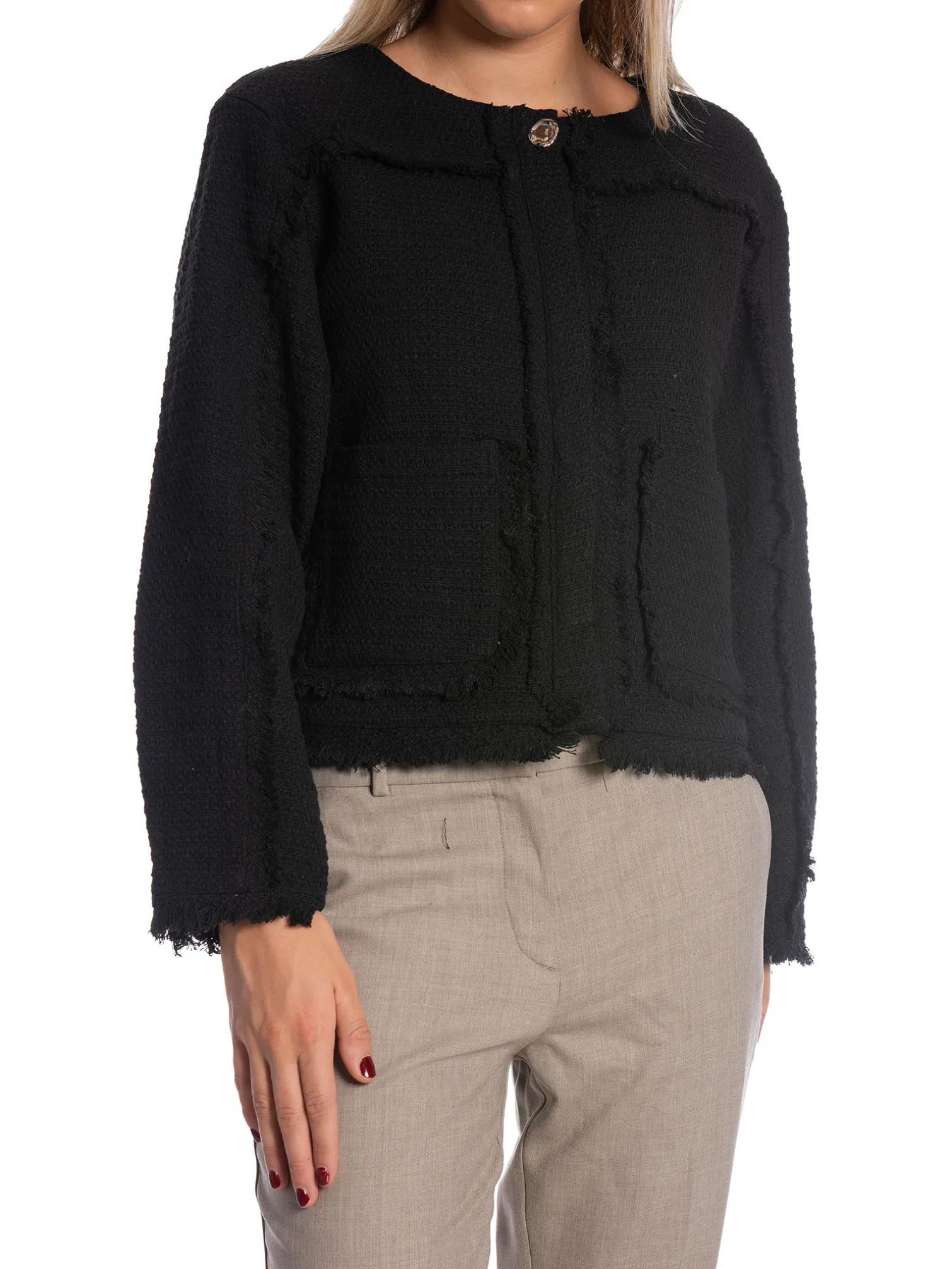 Jacket Lydia from Soft Rebels.A beautiful jacket/ cardigan in a structured pattern and flattering details in the form of fringes. It has two pockets on the front and a hidden fastening.Style with a pair of leather trousers for a trendy autumn look!