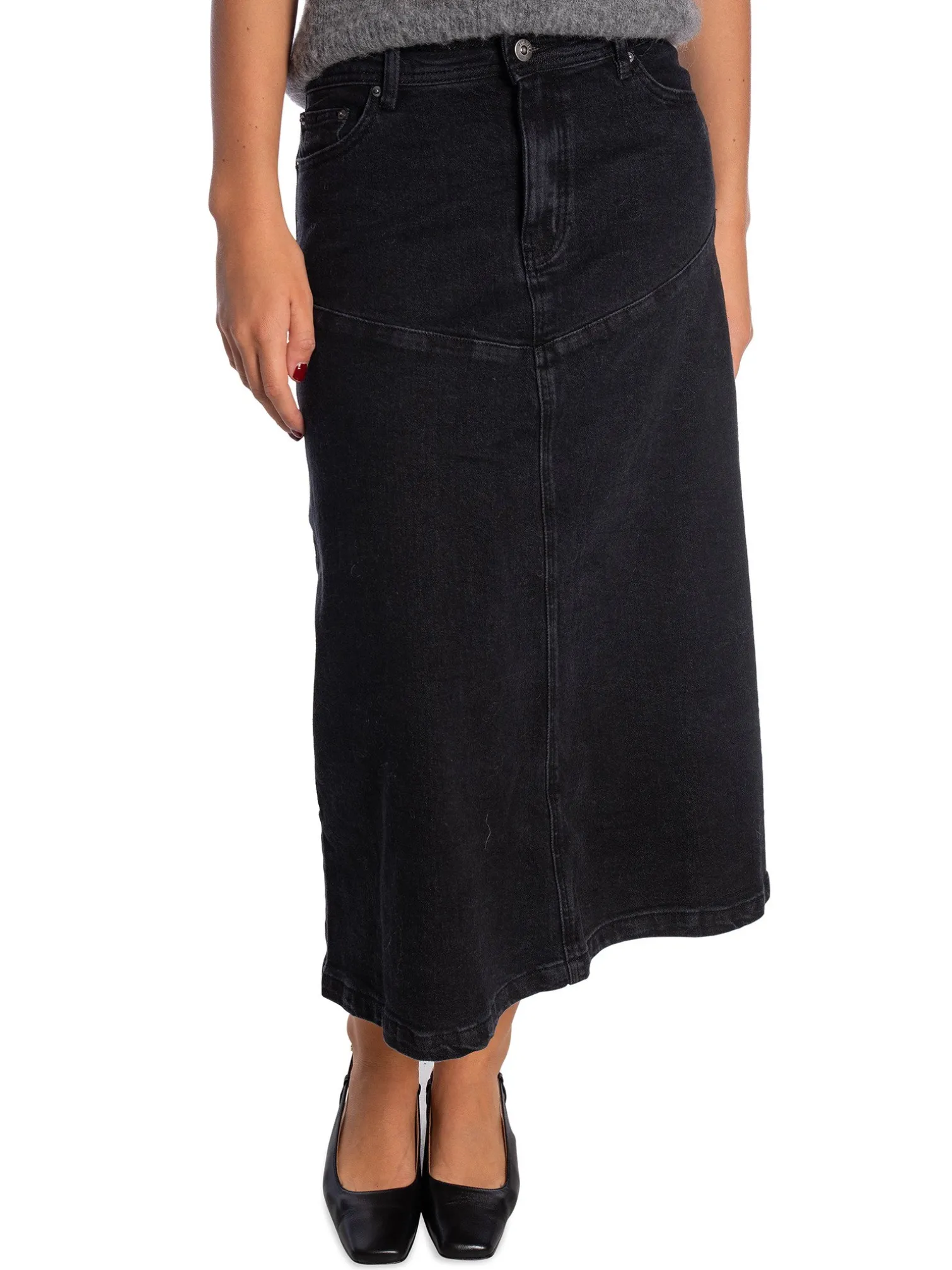 Skirt Jennie Midi from Soft Rebels. Trendy denim skirt with front pockets, wide fit and decorative seams. Designed with a midrise waist, in a stretchy material with button and zip closure at the front. Match with a shirt or knitted sweater for a stylish autumn look!