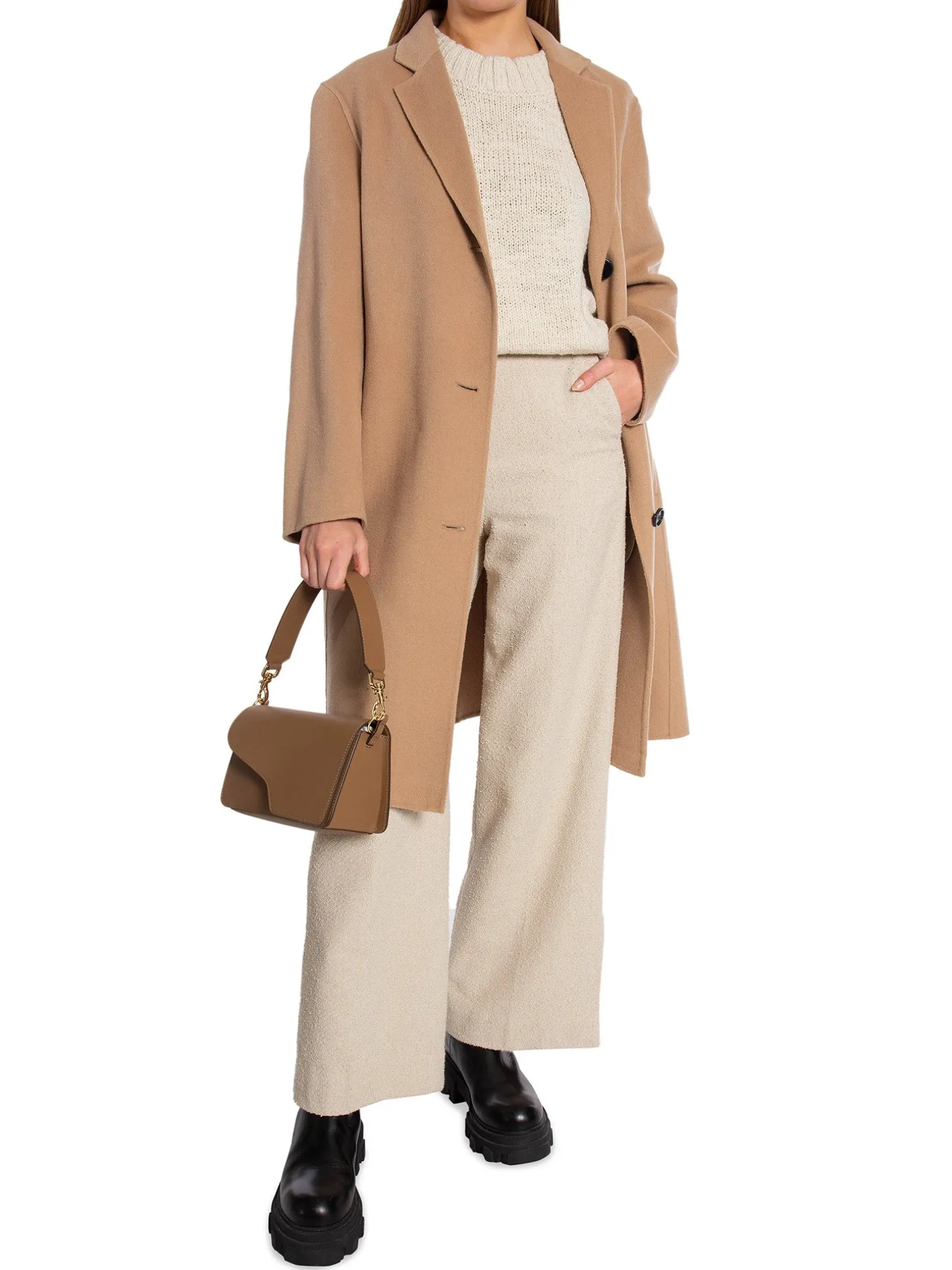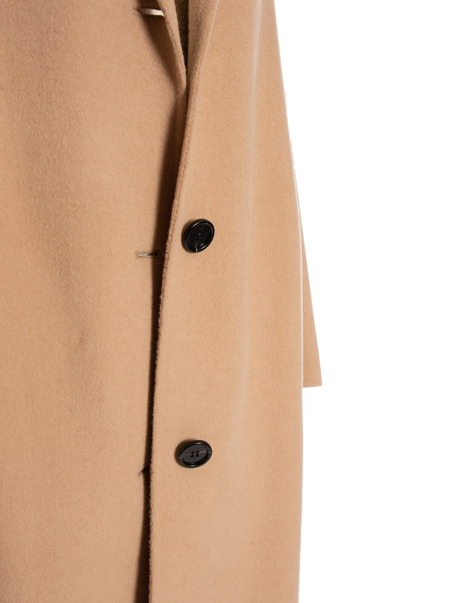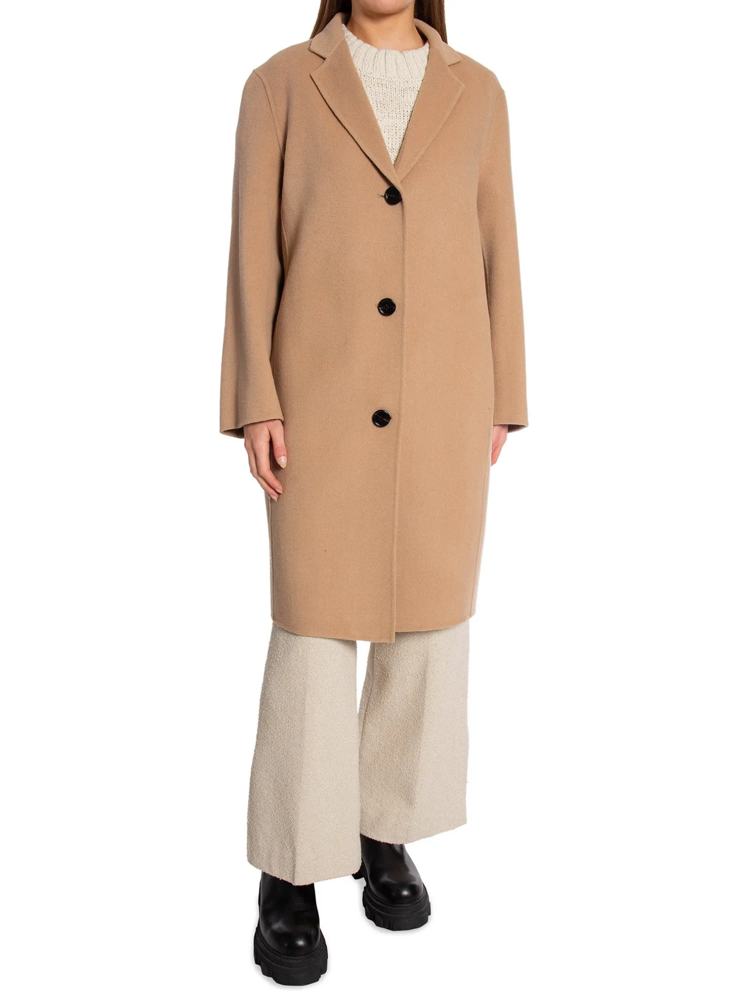 Maile coat from Stand. A lovely oversized coat in camel. The coat has two hidden pockets at side and buttoned closure at front. A timeless coat that is simple to match both for party occasions as well as everyday.