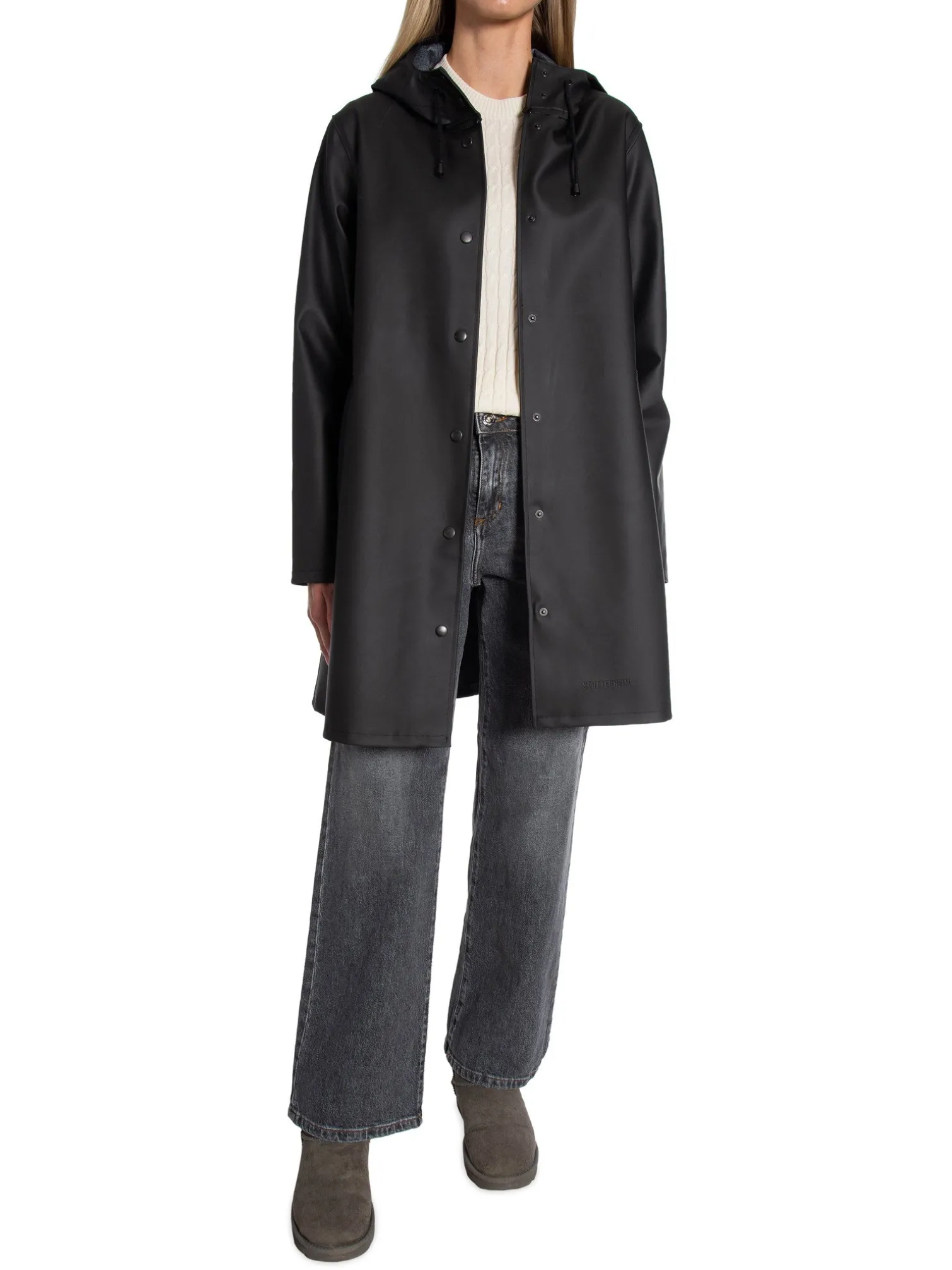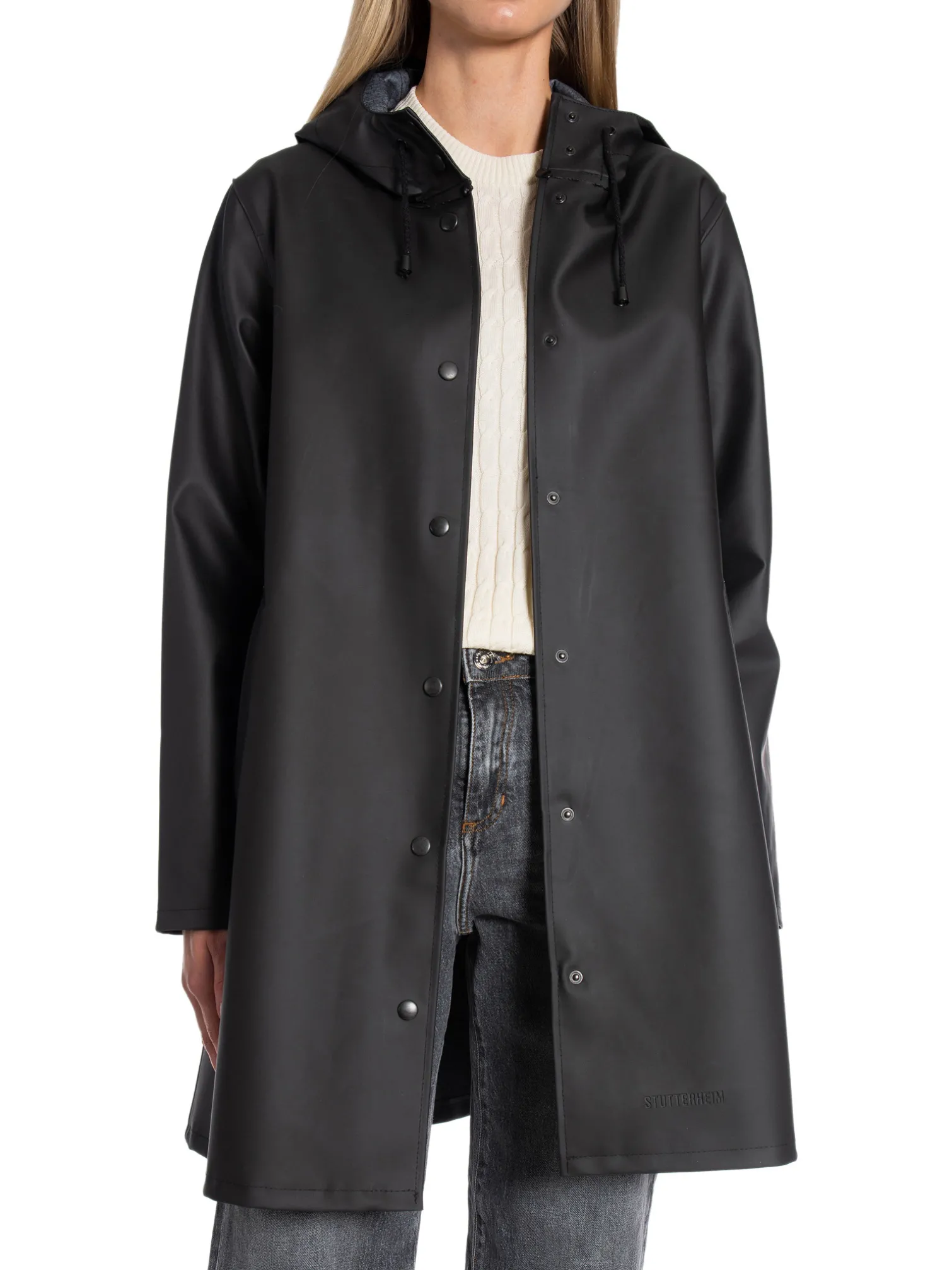 Mosebacke raincoat from Stutterheim. A black coat in A-line shape and a straight fit. The coat has a cap that can be adjusted with a draw-string and two front pockets. A raincoat in a classic model that keeps you handsome in all bad weathers!