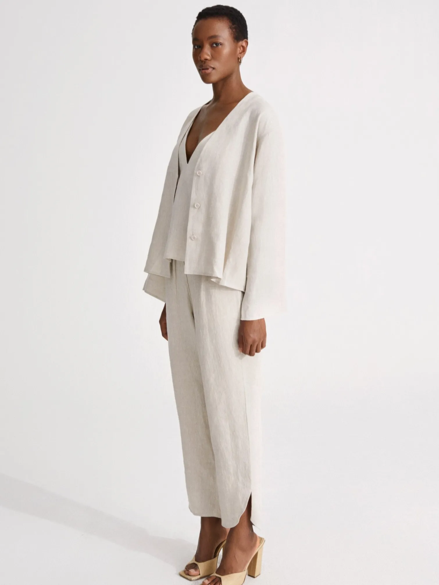 Blouse Sanremo from Stylein. A luxurious beige linen blouse. Designed in a kimono-inspired silhouette. Long sleeves and hidden buttoning at the front. Wear with the matching trousers from the same collection or with stylish suit trousers for a fresh look!