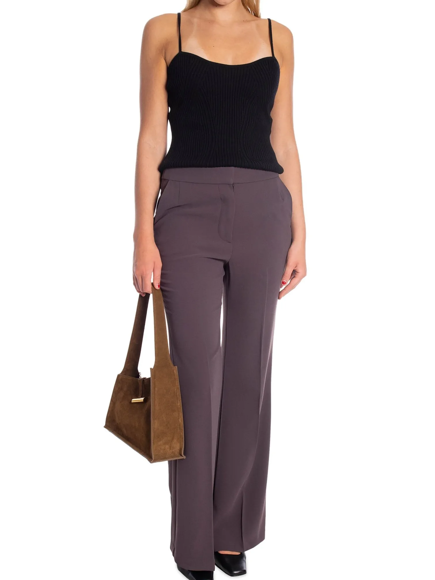 Trousers Beline from Stylein. A stylish suit trouser in dark brown. Designed with stretchy elastic at the back waist for a comfortable fit. Flare at the ankles. The perfect suit pants to add to your basic wardrobe!
