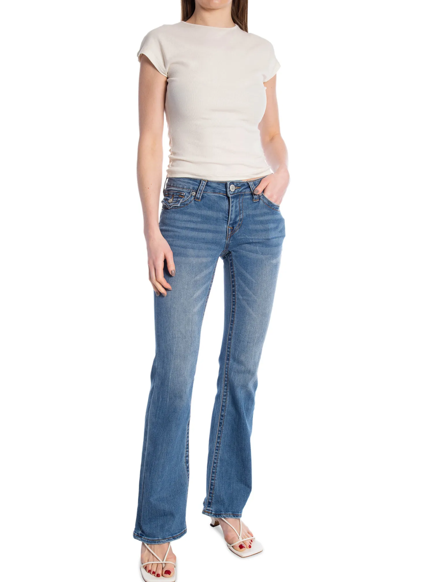 Becca Mid Rise Bootcut Jeans from True Religion. The bootcut silhouette has a slim fit with a mid-rise waist that is equally flattering when worn with flats or heels.