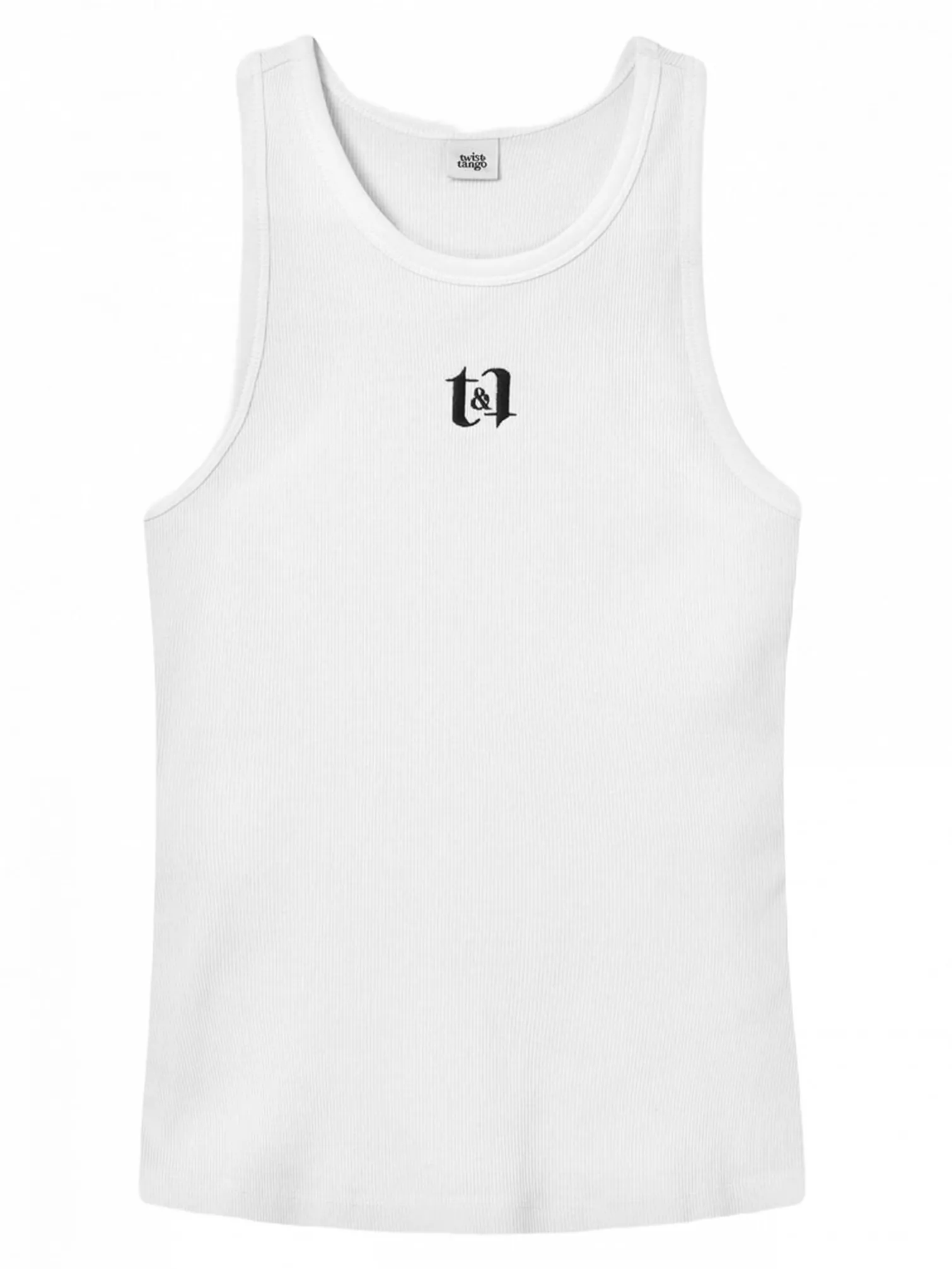 Top Azra from Twist & Tango. Azra is a white tank top with a ribbed cotton racerback and a logo on the chest. It has piping along the armholes and neckline. Wear with all kinds of bottoms. This garment is part of Twist & Tango’s Sustainable Collection and is made from environmentally certified materials.