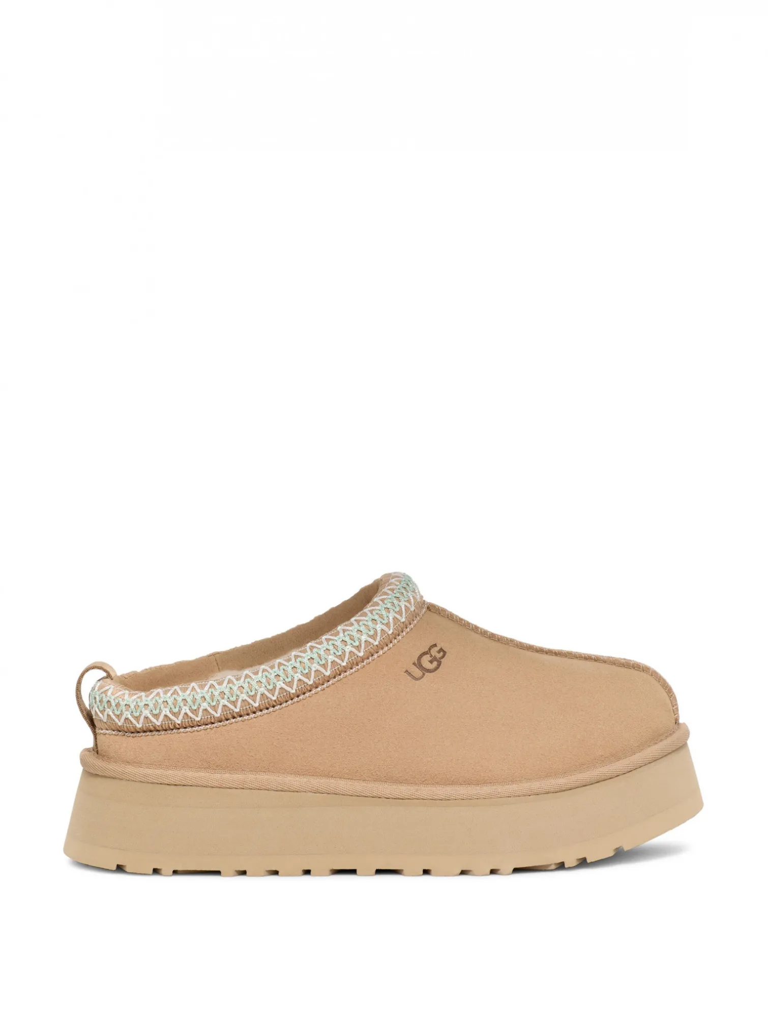 Tazz slipper from UGG. The Tazz model has a grooved platform rubber sole, suede on the outside and a wool blend inside the slipper. This slipper is water and dirt resistant with a lightweight sole – both stylish and practical!