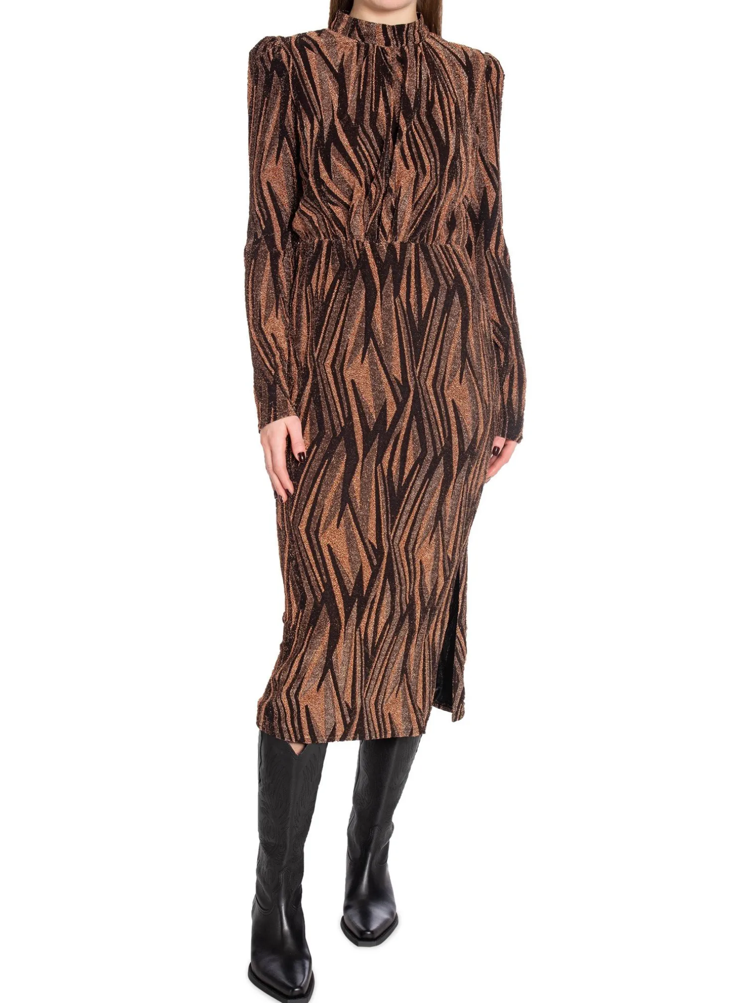 Dress Yasyen from Yas. A lovely dress in a abstract pattern with a glittery effect. Designed with puffy shoulders and a waistband featuring an elegant silhouette. wear with a pait of boots or heels for a festive look!