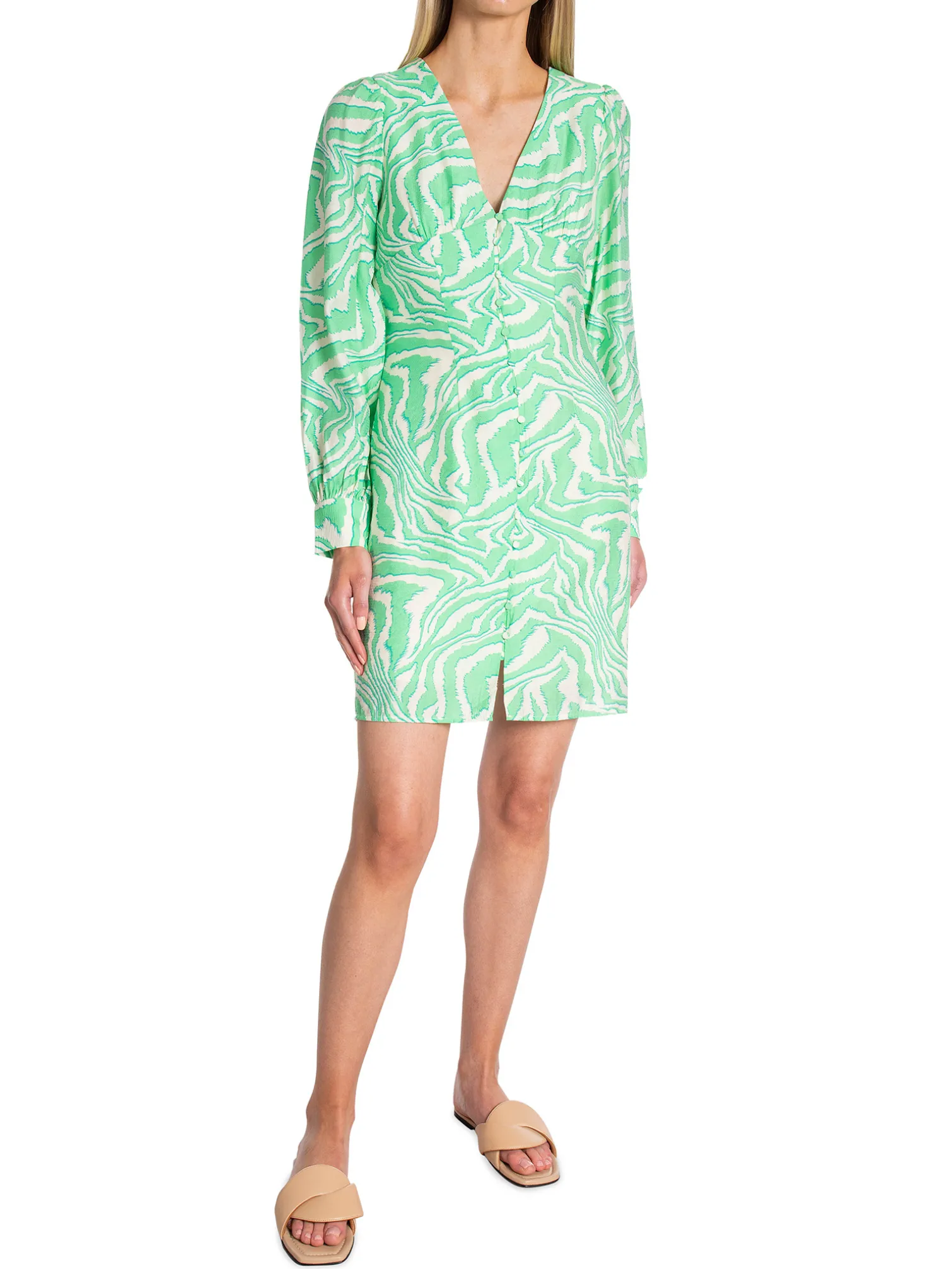 Yaszebena from YAS. A stylish dress with a graphic zebra pattern in green tones. Designed with decorative small buttons at the front, a v-neck and frilled details at the bust and the long slightly puffy sleeves.