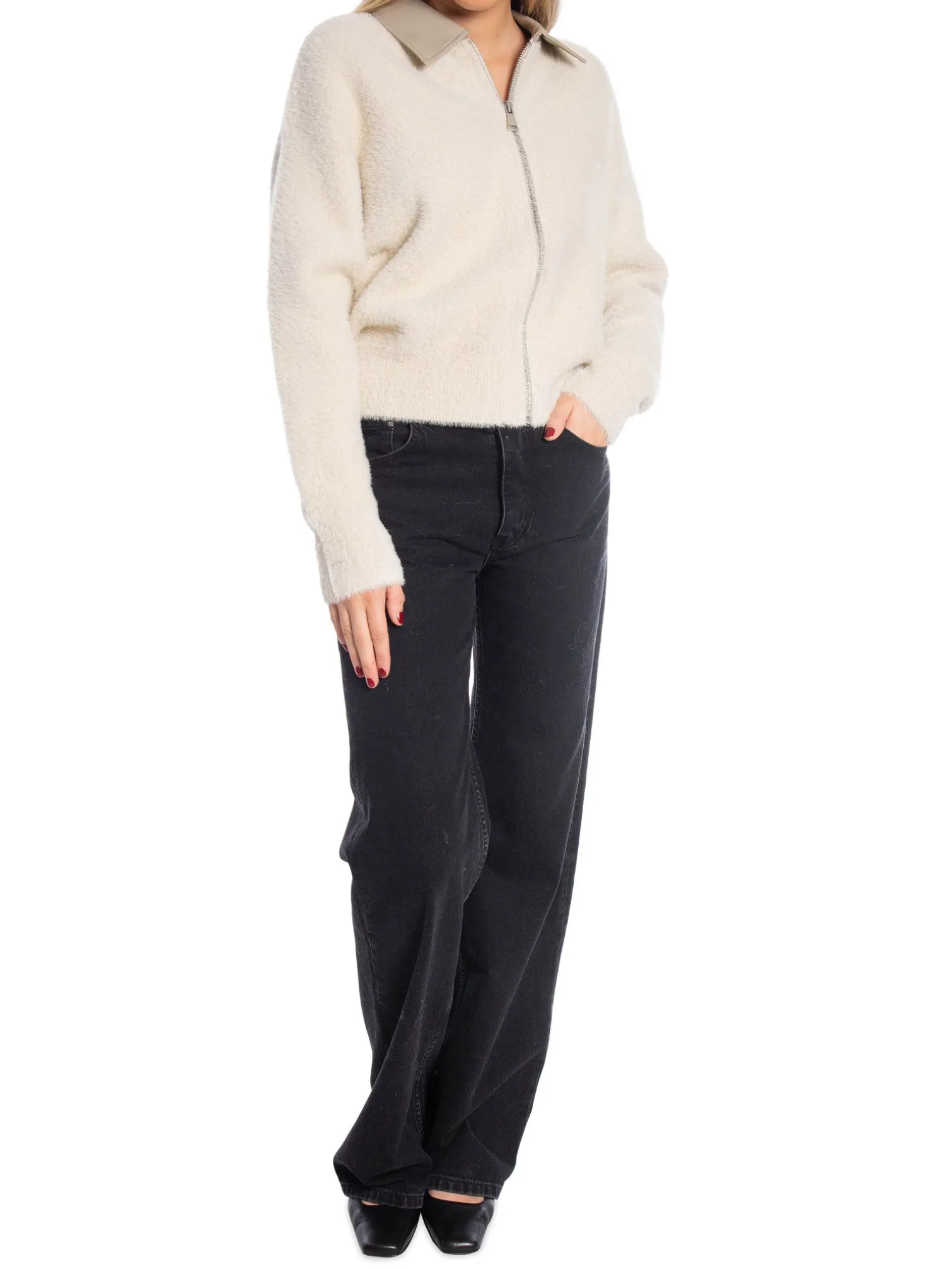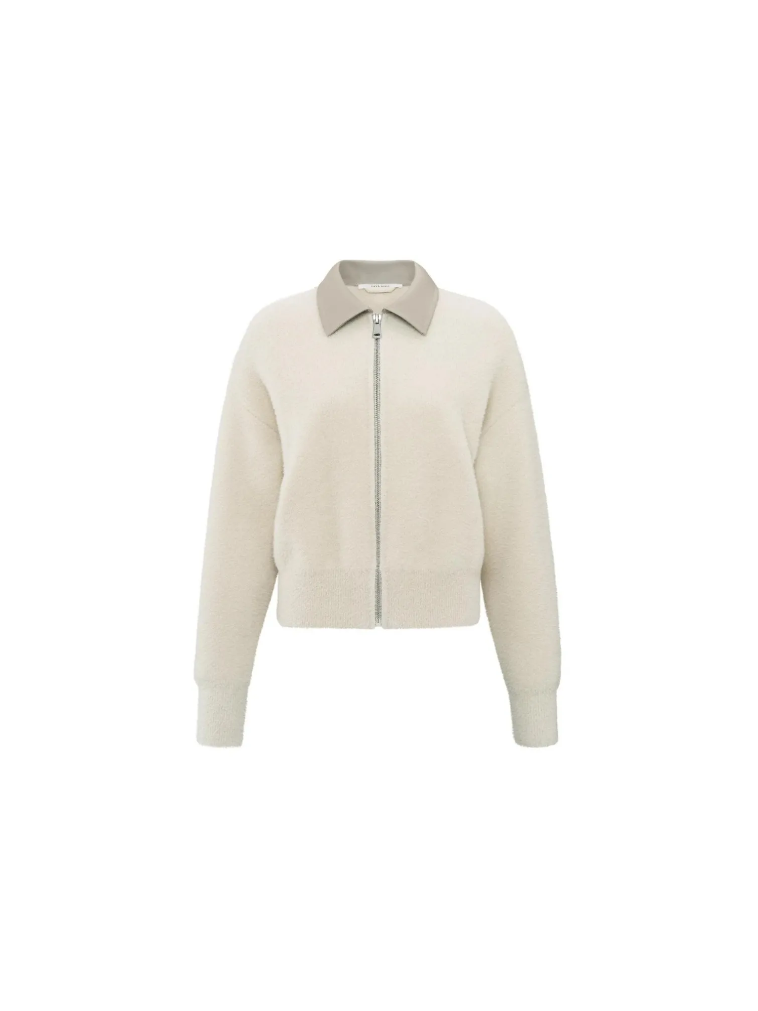 Cardigan Furry from Yaya. A knitted cardigan with a faux leather collar that gives the garment a luxurious feel. It has a straight fit and closes with a zip. Wear with your favorite jeans!